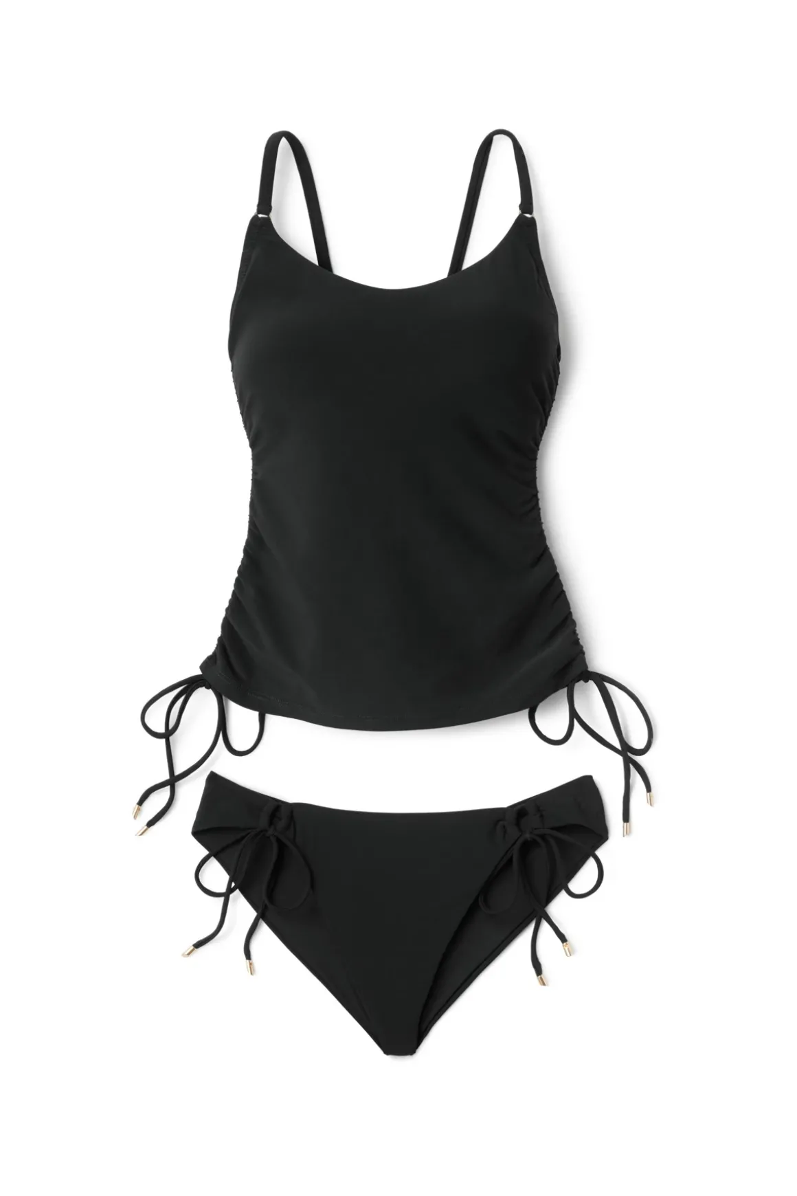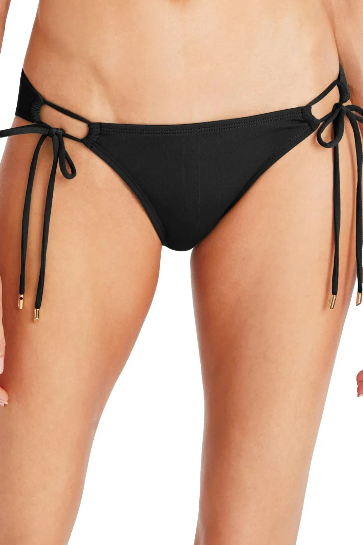 Aubrey hipster bikini bottom offers loop ties at hips and moderate coverage.