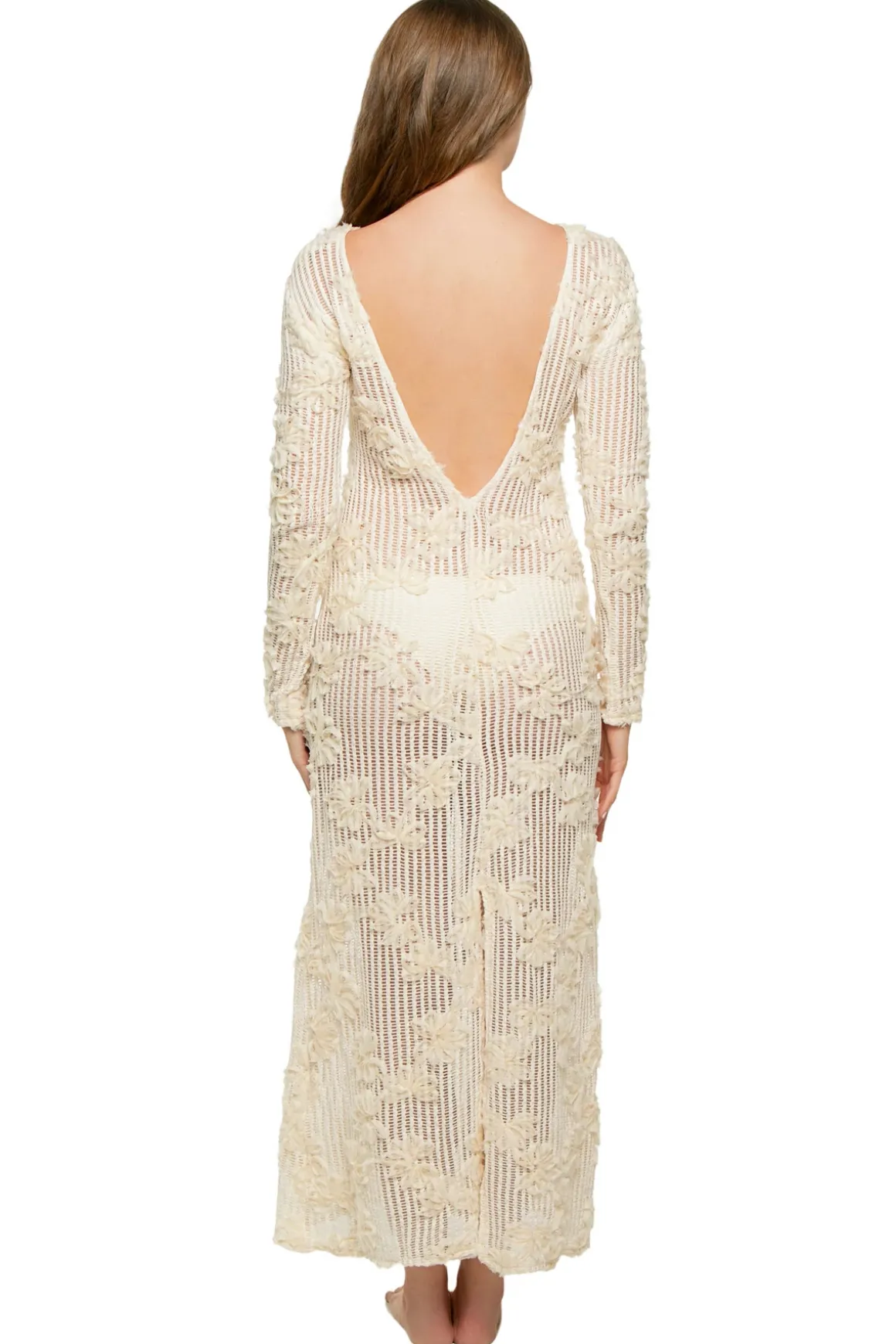 Azalia maxi dress features open weave crochet fabric, floral applique, long sleeves, and open back.