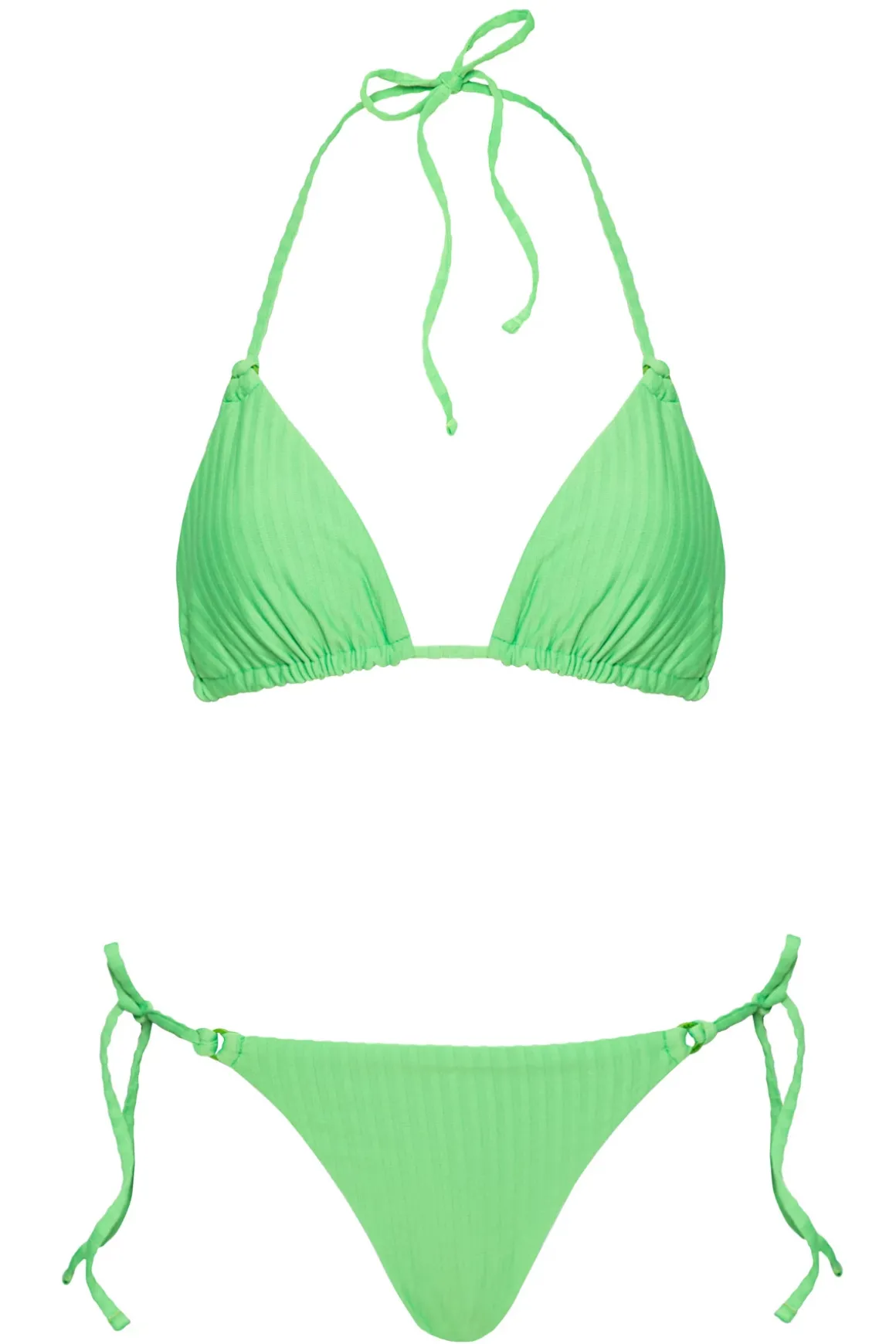 Reversible triangle bikini top features textured fabric, removable soft cups and offers adjustable ties at neck and back.