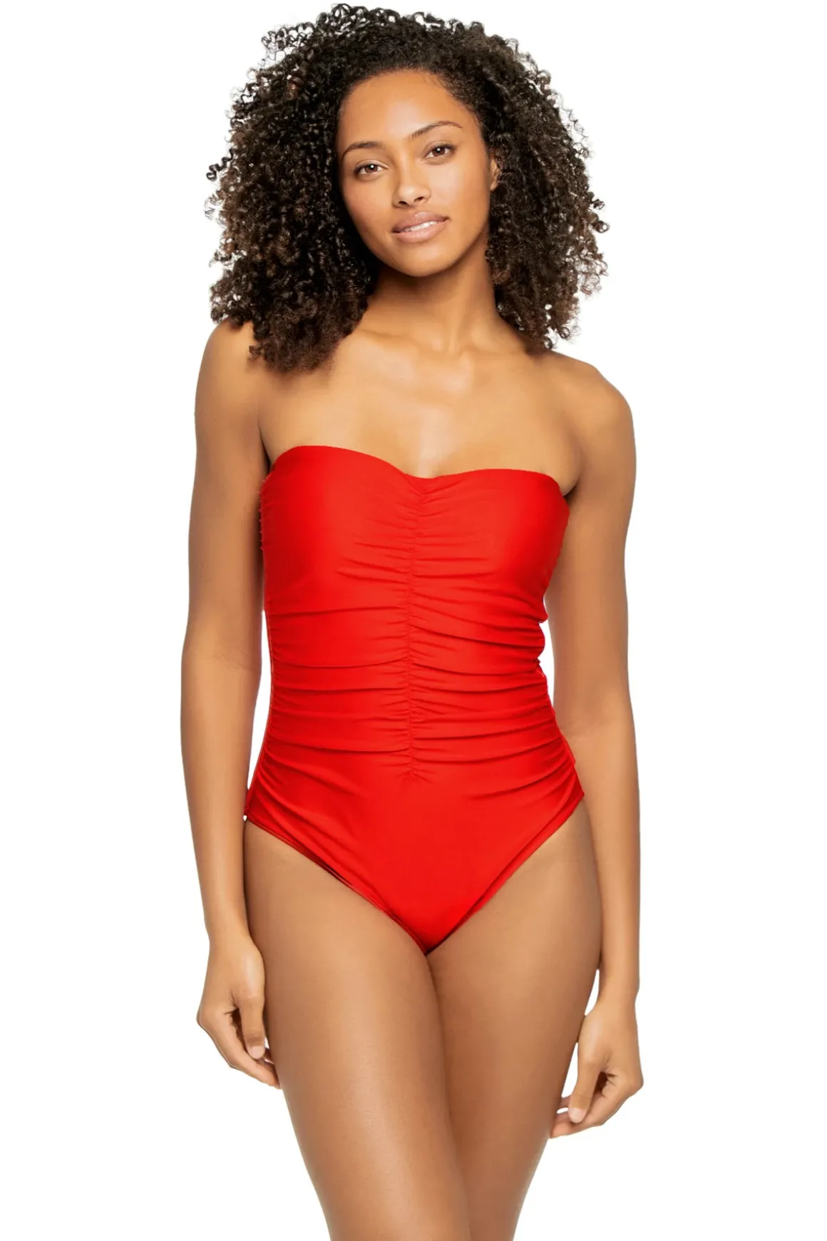 One piece swimsuit features shirring that flatters every figure and a sweetheart neckline. Offers removable adjustable straps that allow for a customized look and moderate bottom coverage.