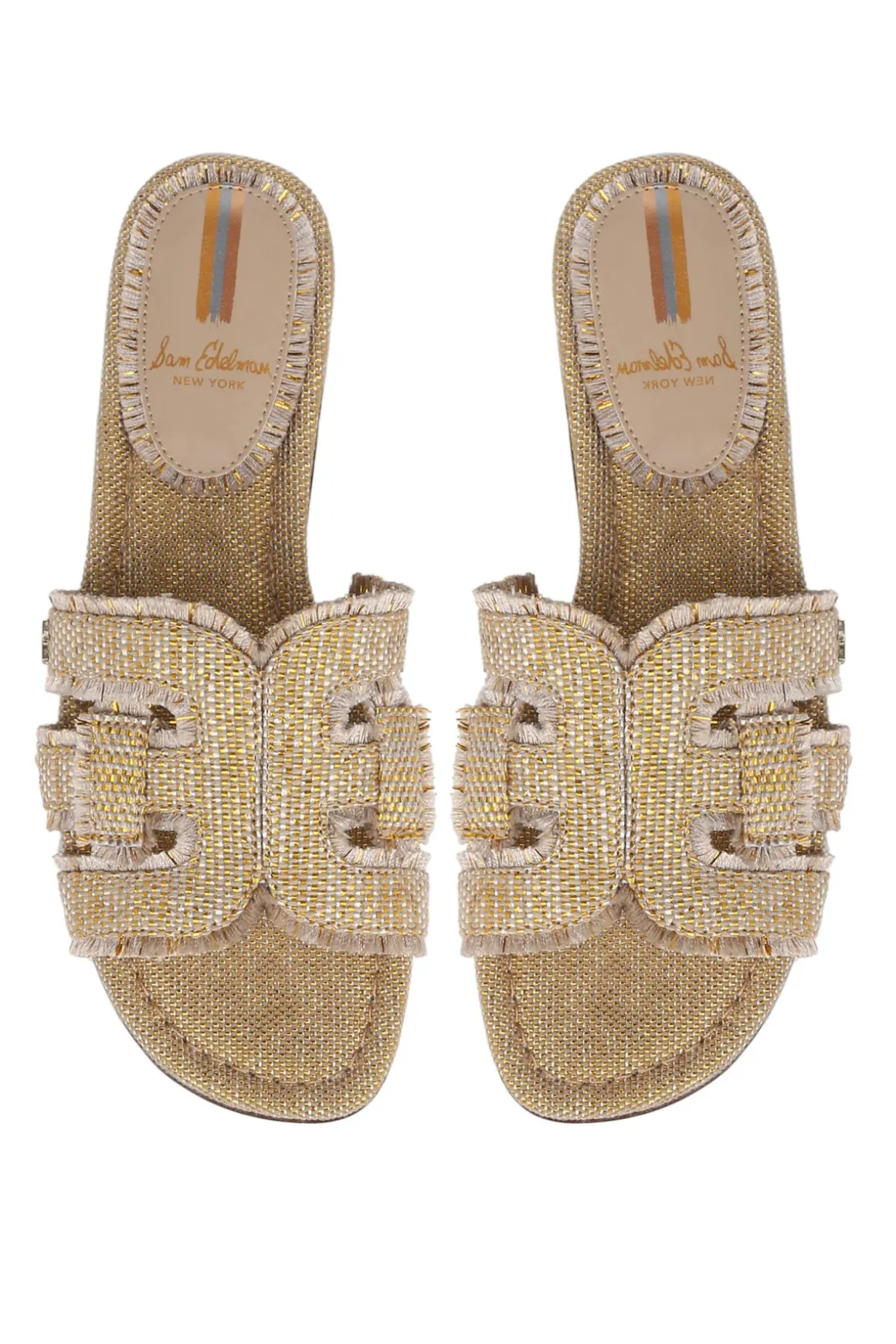 Bay Fray slides feature the brands signature burlap double-E logo strap with a frayed edge.