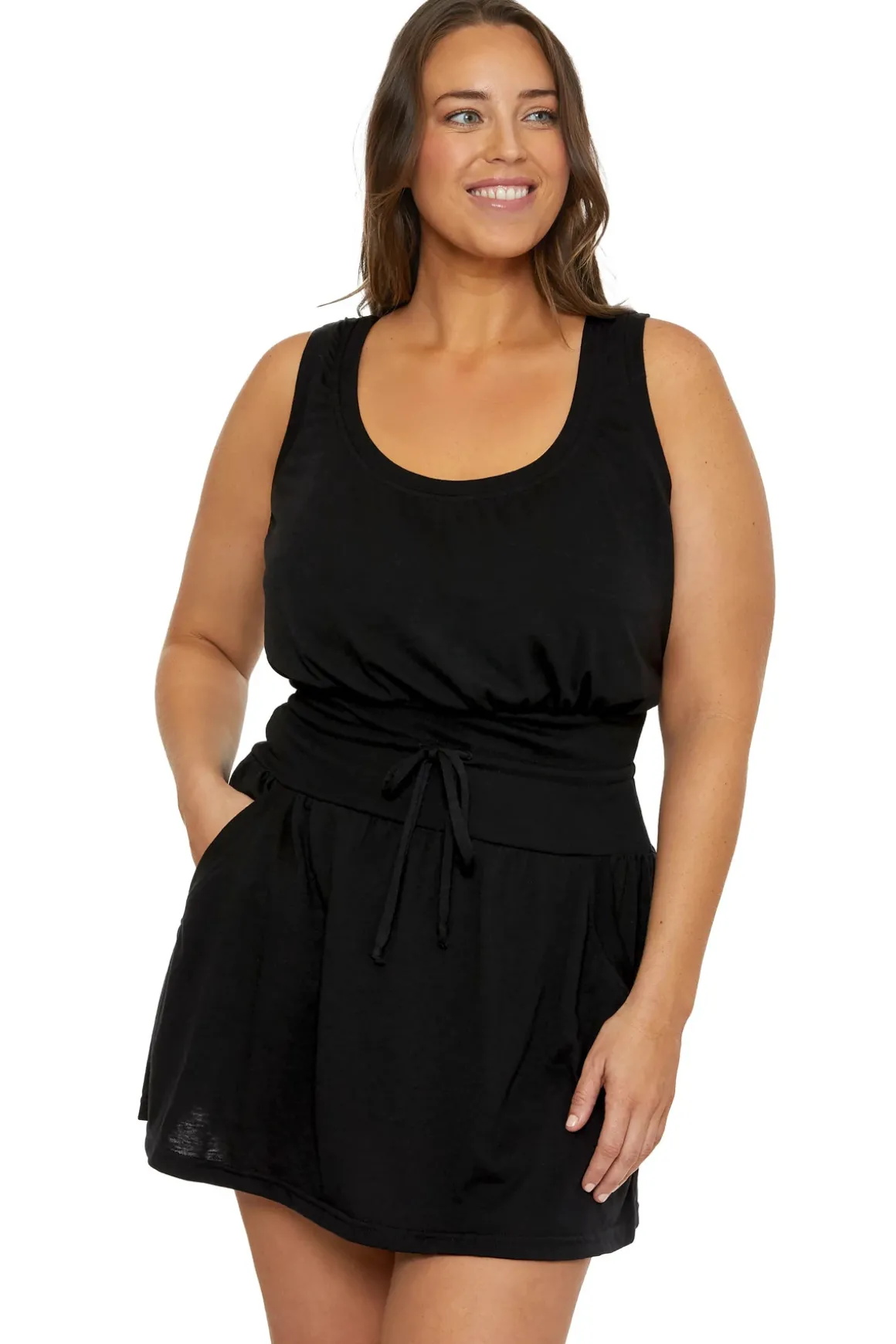 Beach date dress features a round neckline, flexible waist with drawstring, and offers side pockets.