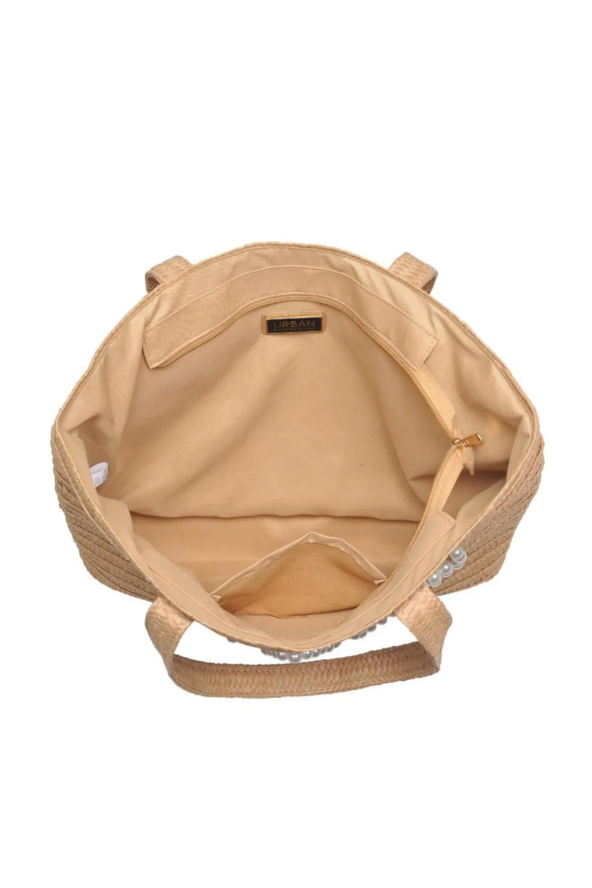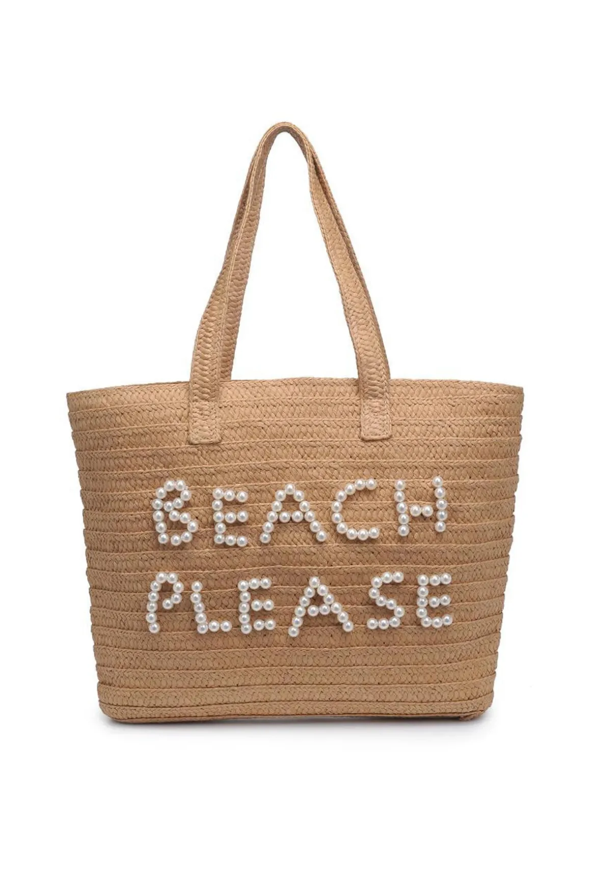 Tote features woven straw, dual handles and adorned with novelty pearl phrasing “Beach Please”.