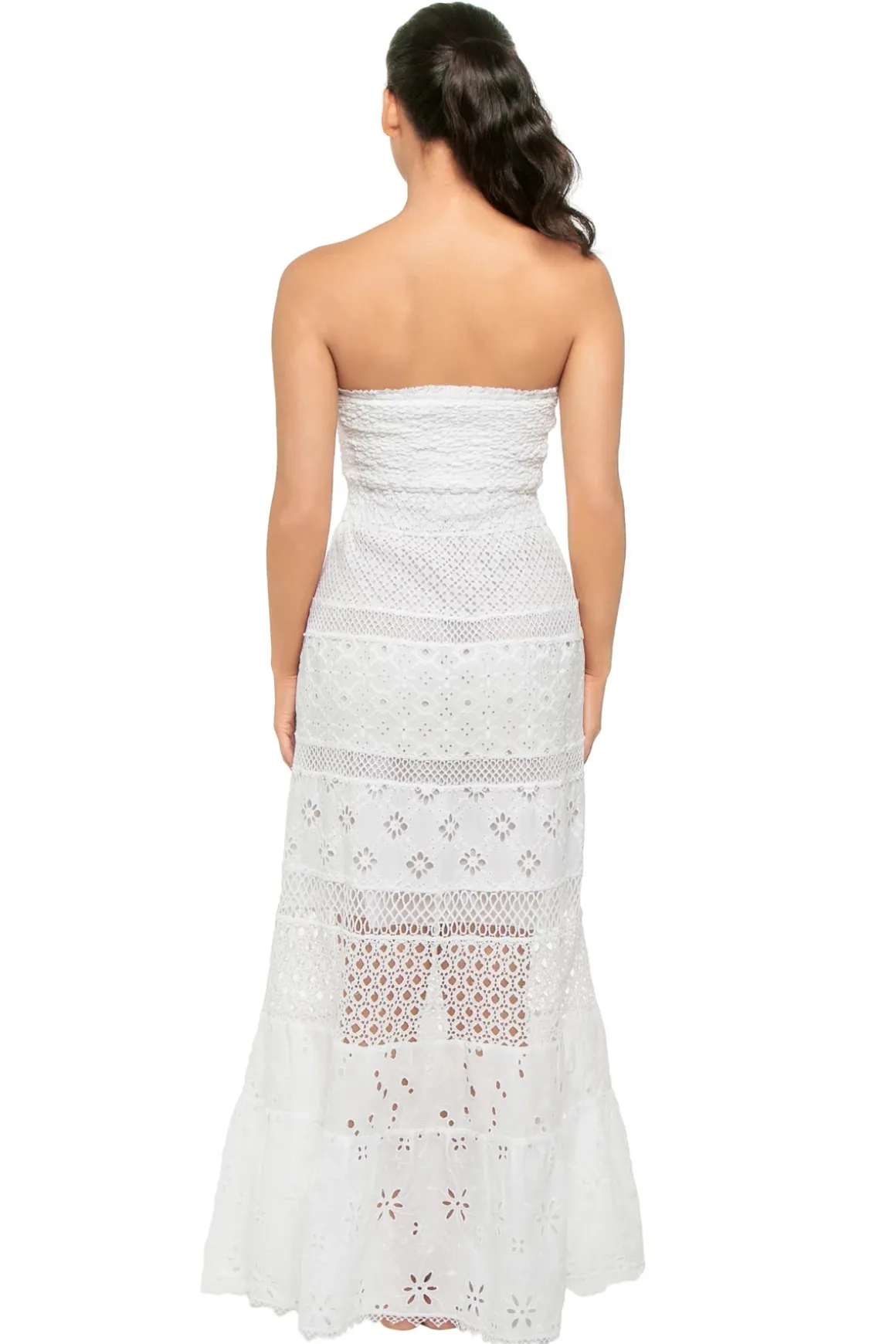 Maxi dress features embroidery and eyelet details and a strapless smocked neckline. Offers a smocked top for an easy pull on fit.