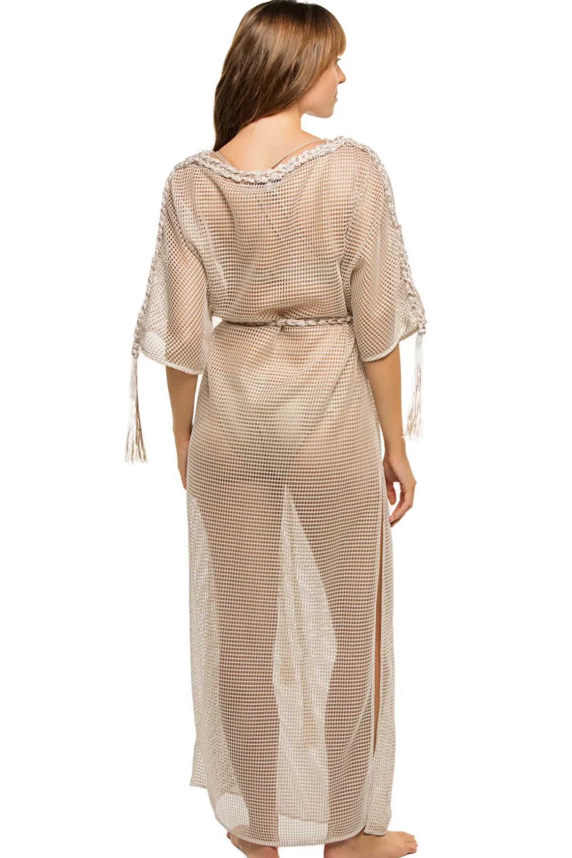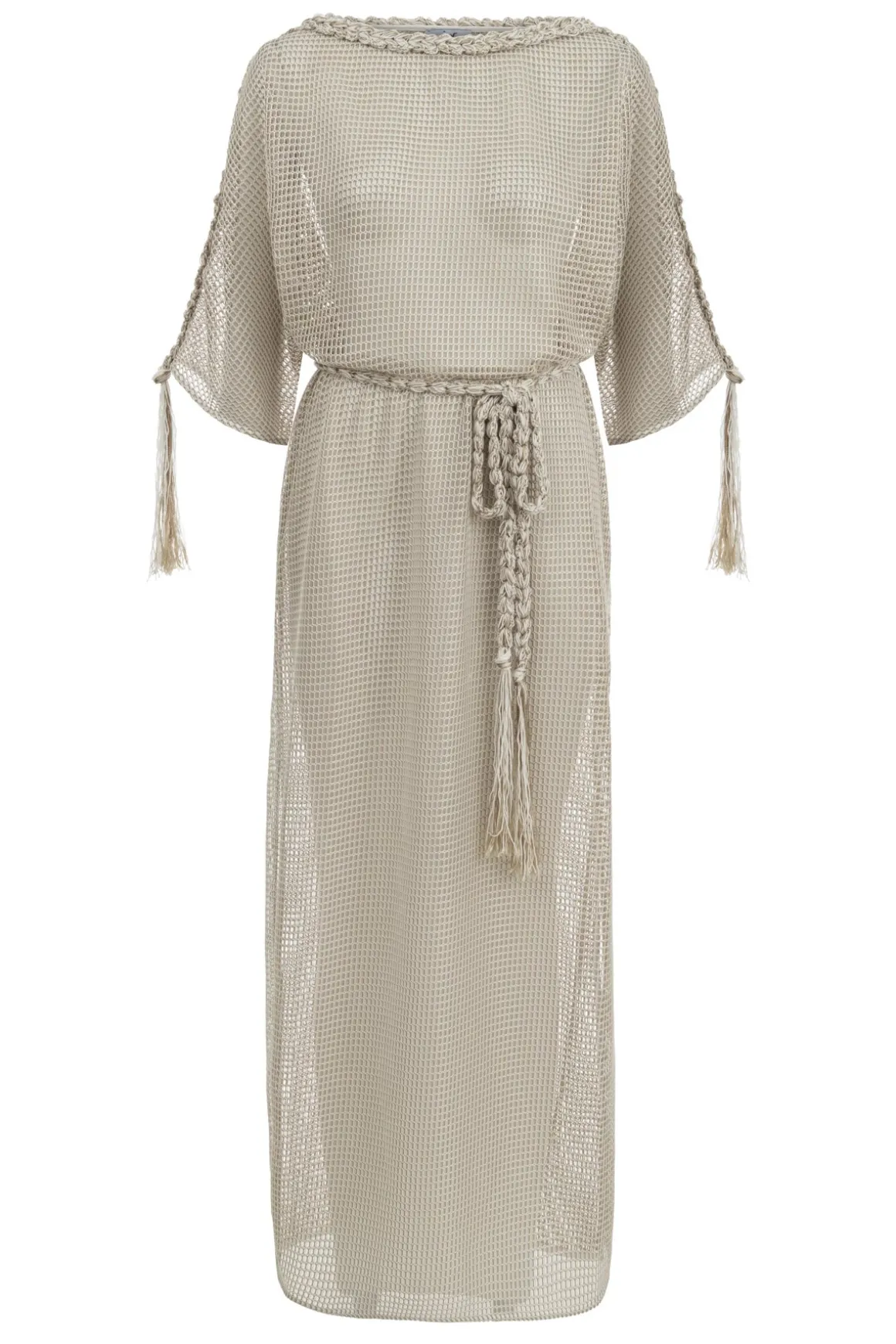 Maxi dress features an open weave crochet with braided detailed hems and offers a removable waist tie.