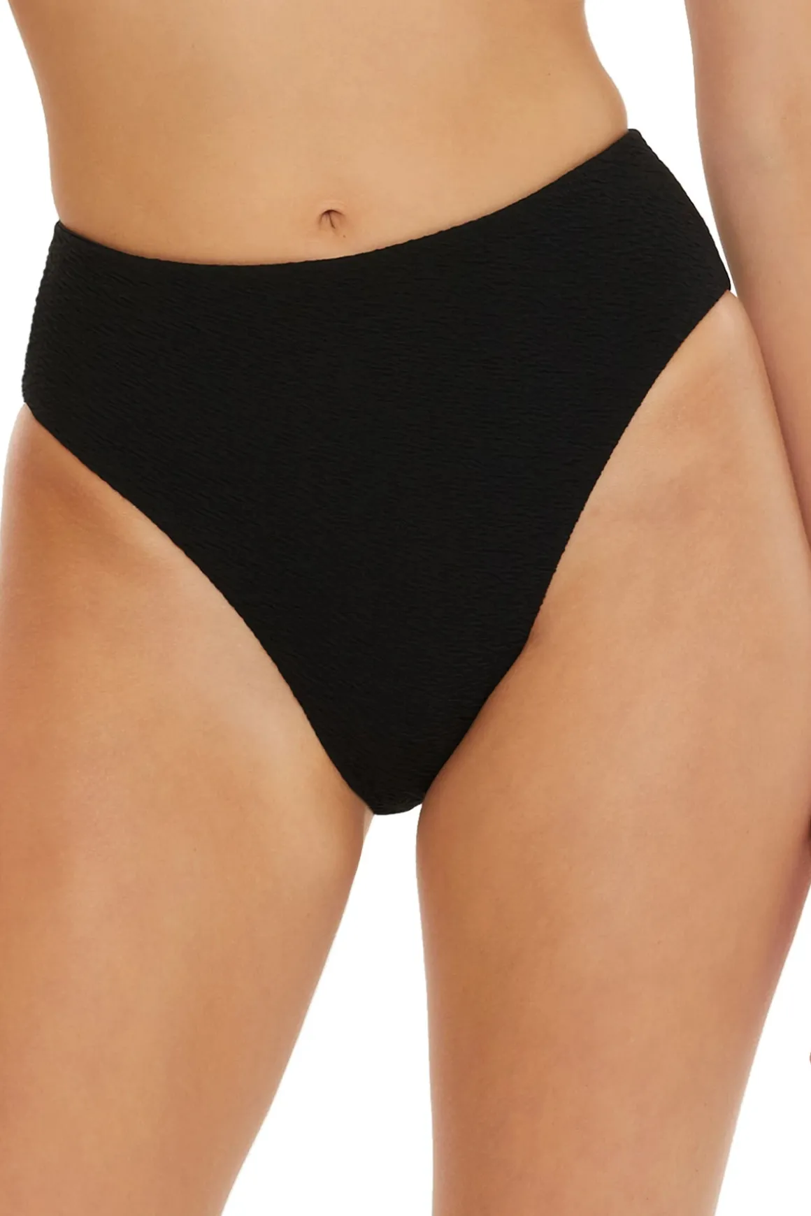 Black sands high waist bikini bottom features a crinkle texture, twist back detail and offers a high leg cut with moderate coverage.