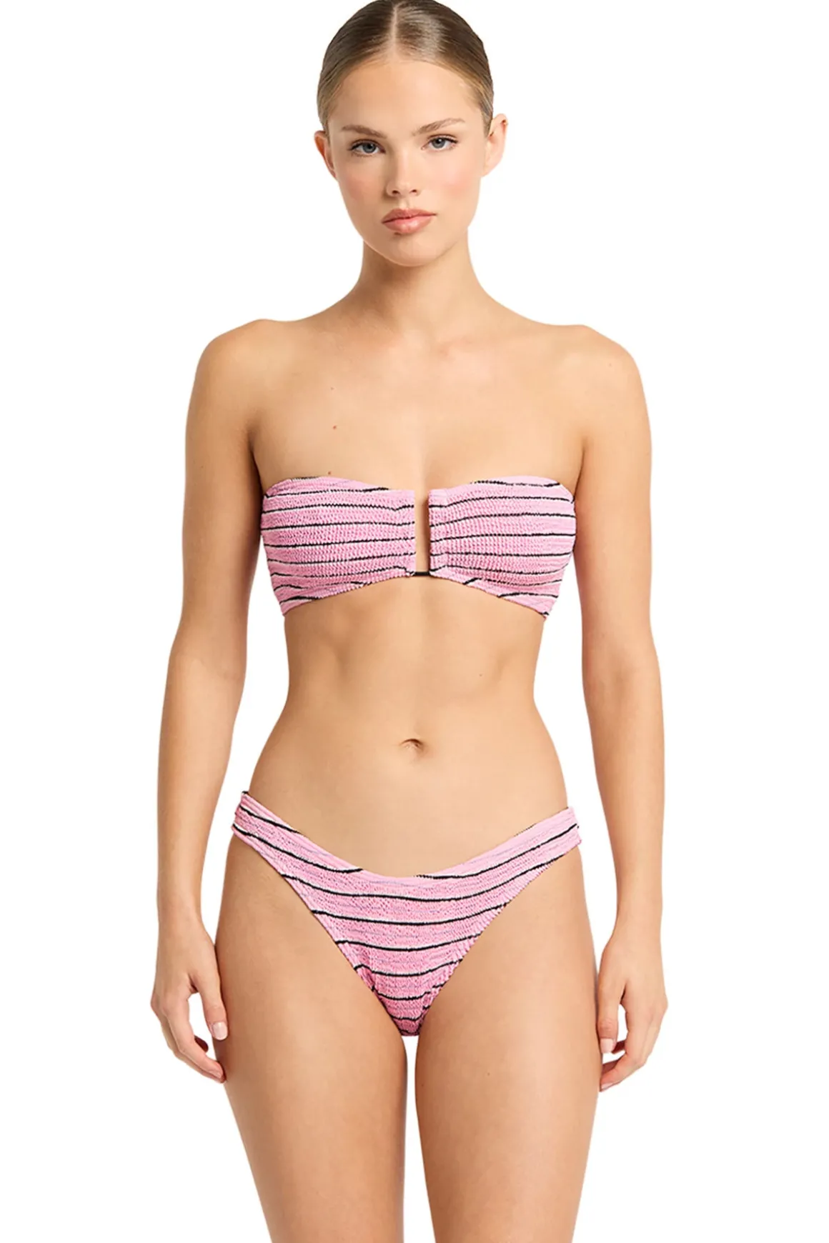 Blake crinkle stretch bandeau bikini top features a U-front accent. Offers light support, best for small to medium bust sizes.