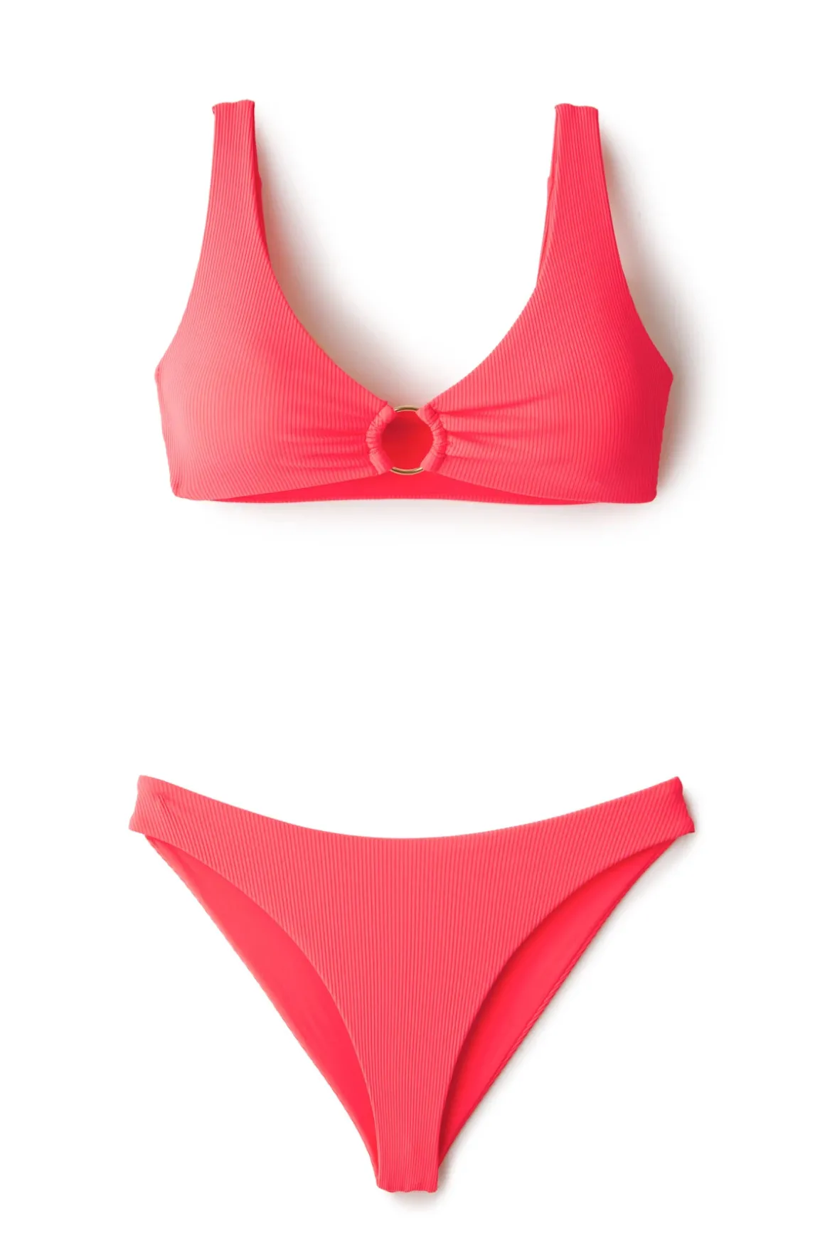 Bonaire bralette bikini top made from an eco rib fabric features a scoop neck with a gold ring connector. Offers fixed straps and a pull on fit.