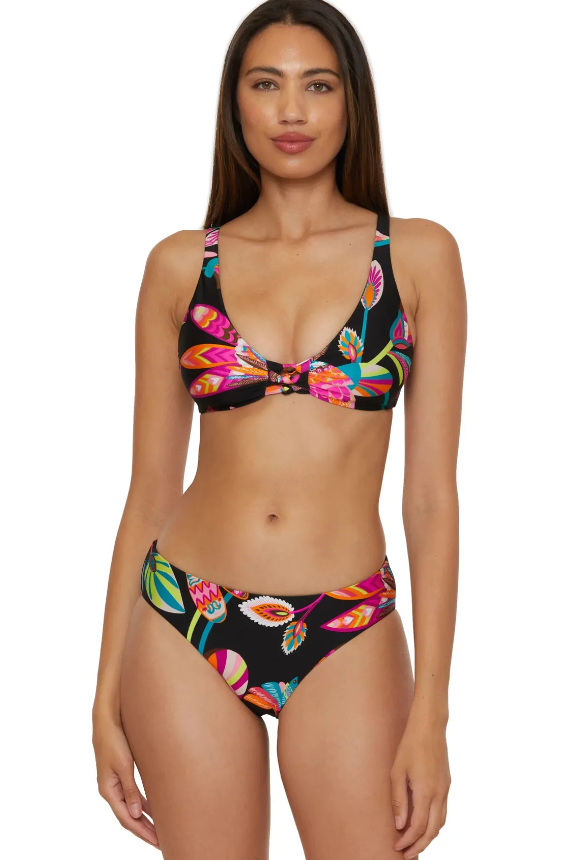Bikini top features floral print and front knot detail. Offers removable soft cups, adjustable straps, and a tie back closure.