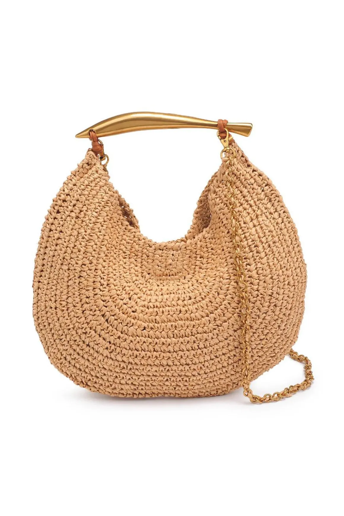 Brielle Crossbody features a woven design, brass handle, detachable chain strap, and a magnetic closure.