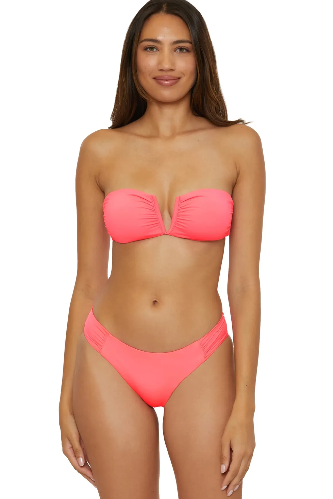 Brinley bikini top features a v-wire front with shirred detailing. Offers removable adjustable halter straps, molded cups, side stays, and a tie back closure.