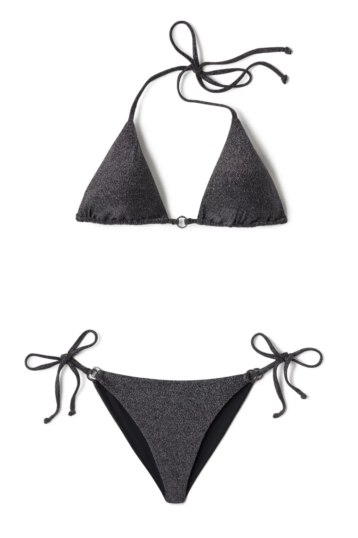 Cabo bikini bottom features a metallic fabric with gold ring accents. Offers adjustable tie sides and minimal coverage.