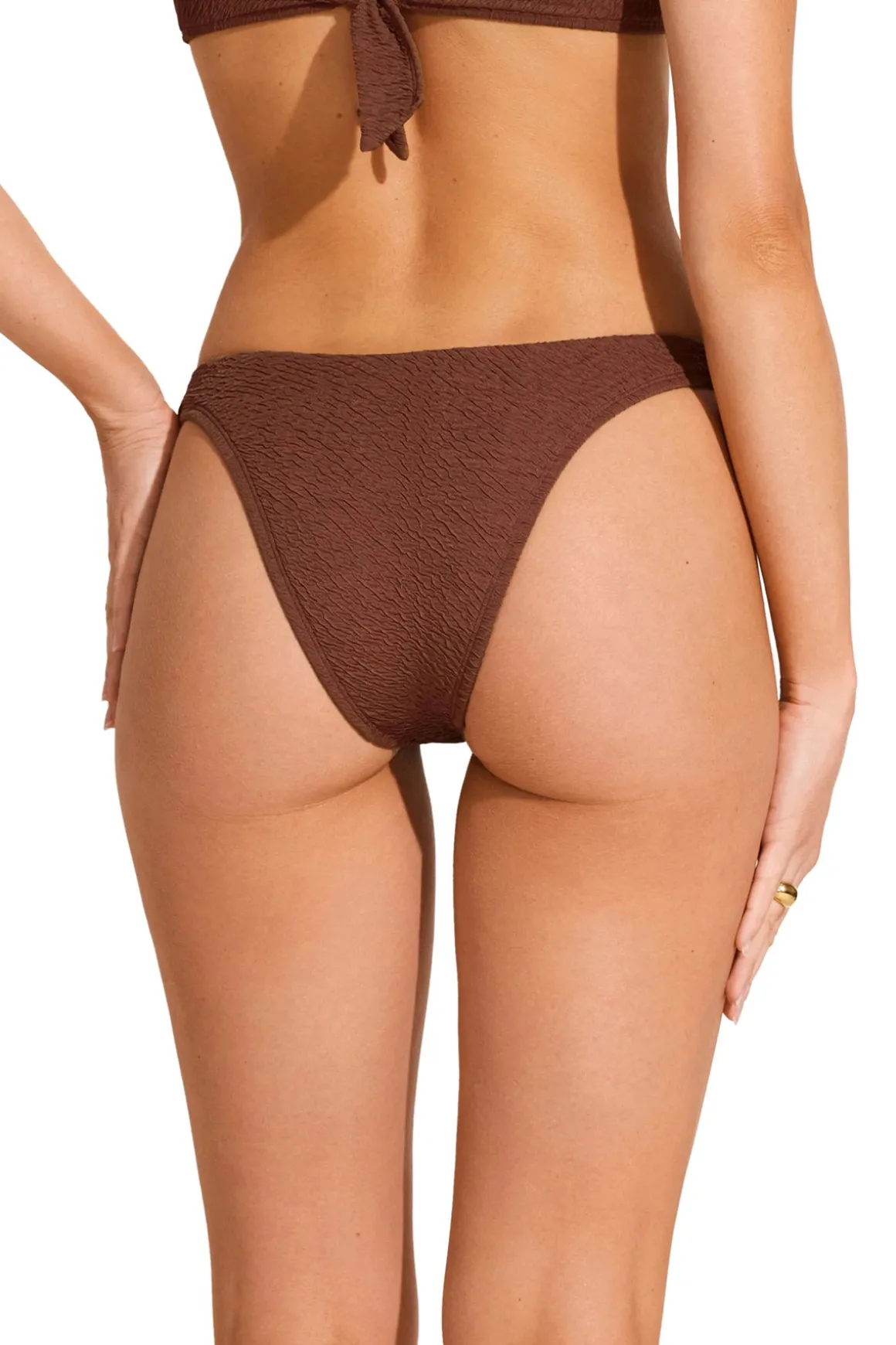 Cali brazilian bikini bottom features textured fabric, high leg cut and minimal bottom coverage.