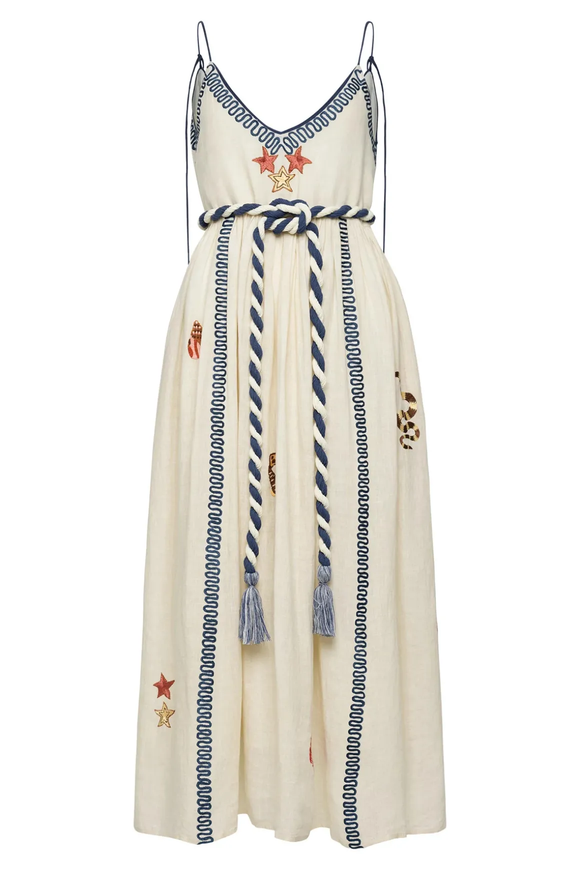 Carmen tropical theme maxi dress features a contrast striped removable rope belt and offers adjustable straps