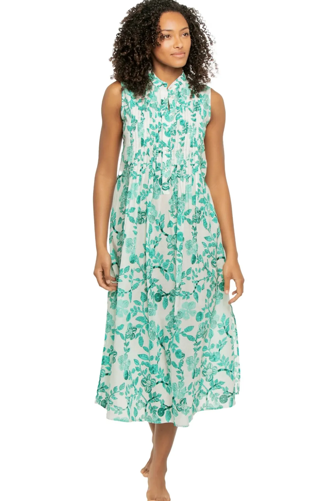Midi dress features a high neckline with a mandarin style collar, button up front and pleated top.