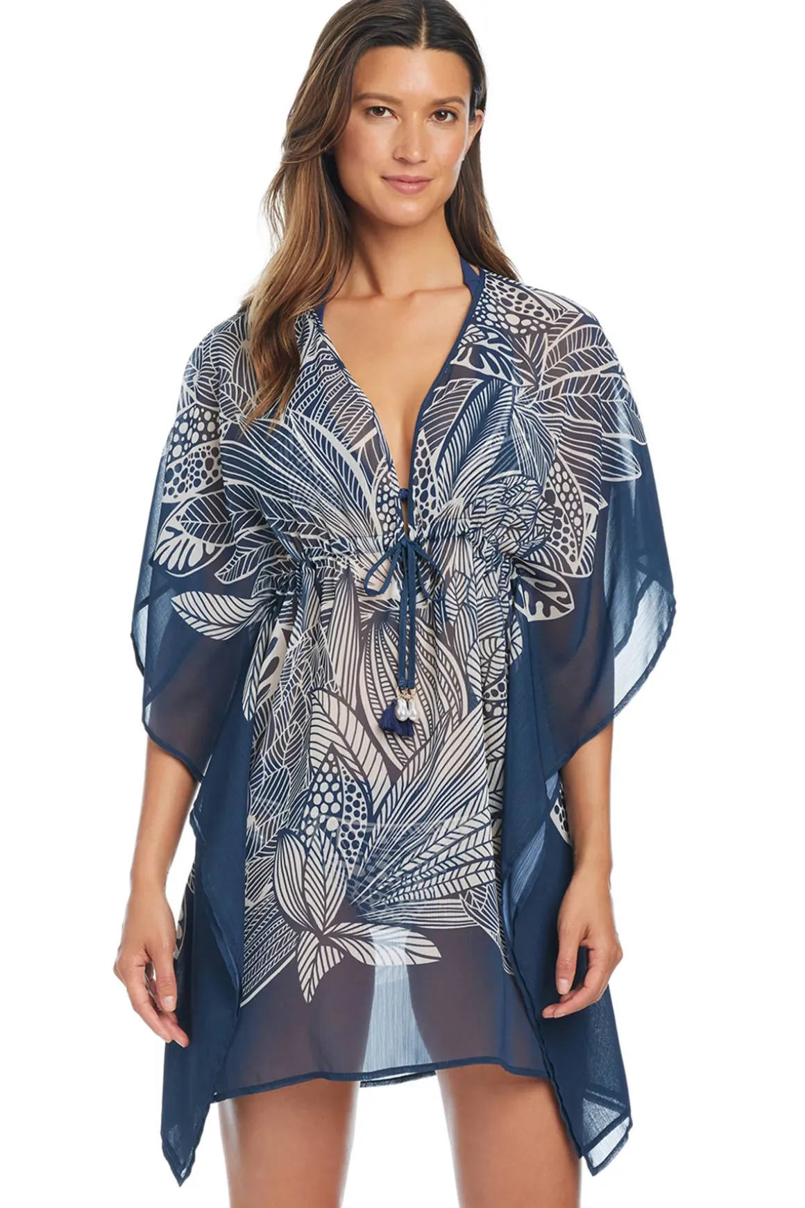 Caftan features plunging neckline, butterfly sleeves and drawstring tie adorned with tassel details.