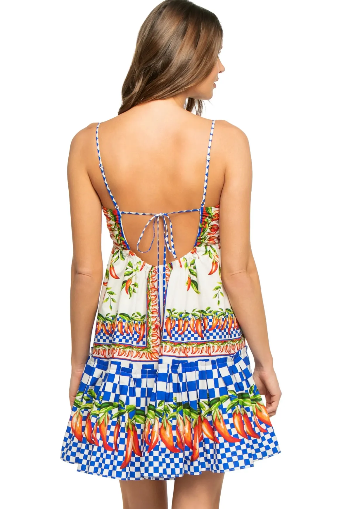 Mini dress features chili pepper detailed print, deep v-neckline, adjustable over the shoulder straps, tie back closure and ruffle hem.