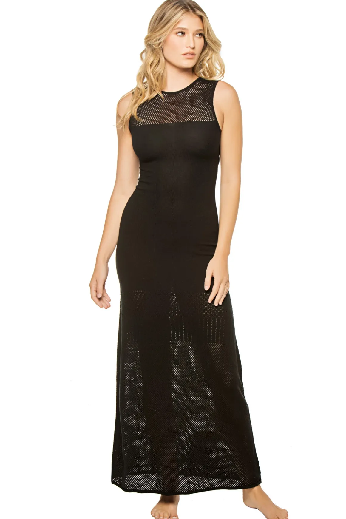 Clara maxi dress features an open weave high neck with a slim fit that offers an open back with tie closures.