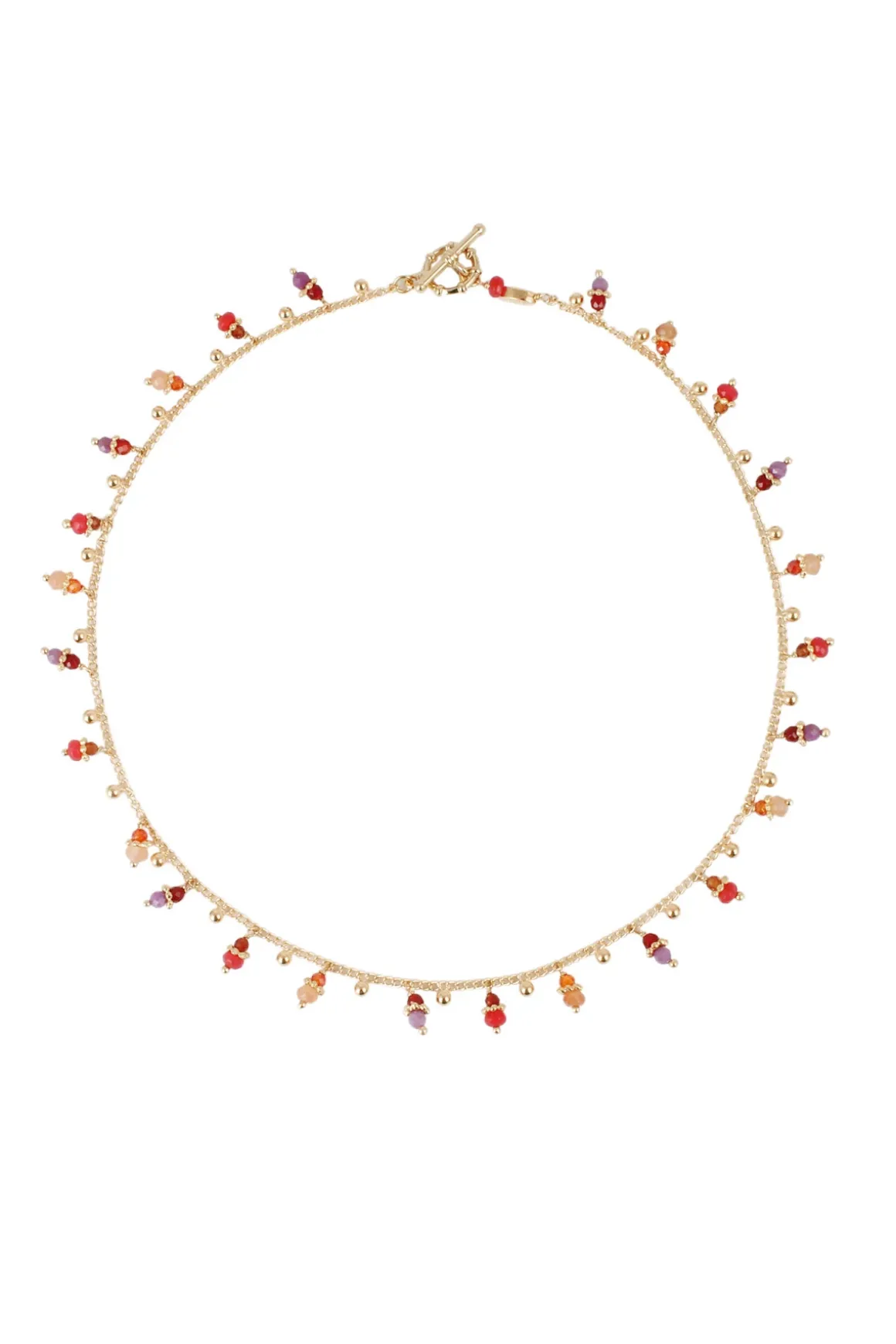 Collier tangerine necklace features 24k gold-plating adorned with semi precious stones and glass beading.
