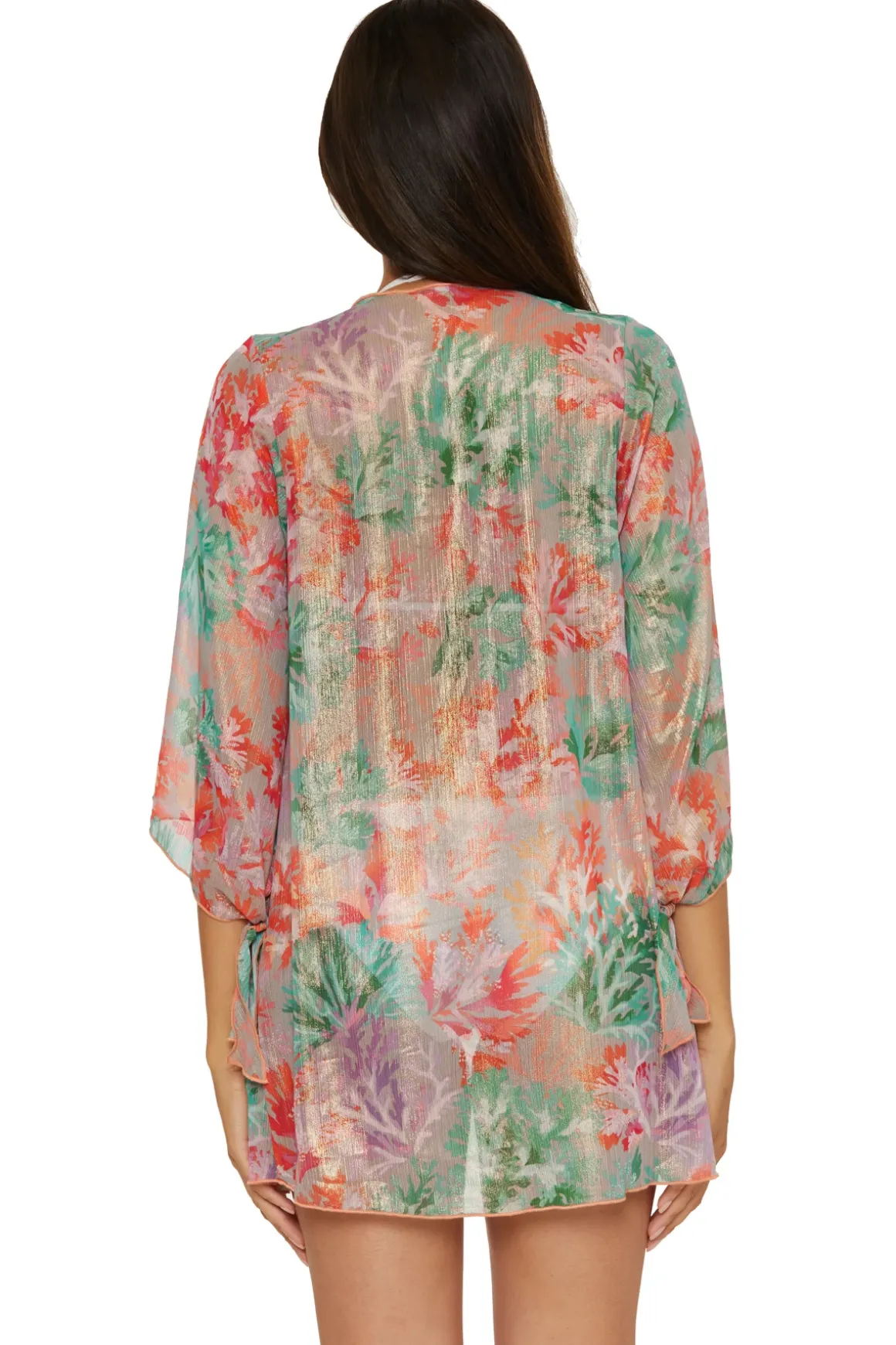 Kimono features sheer fabric with gold foil dusting, 3/4 sleeves, and a tie front.