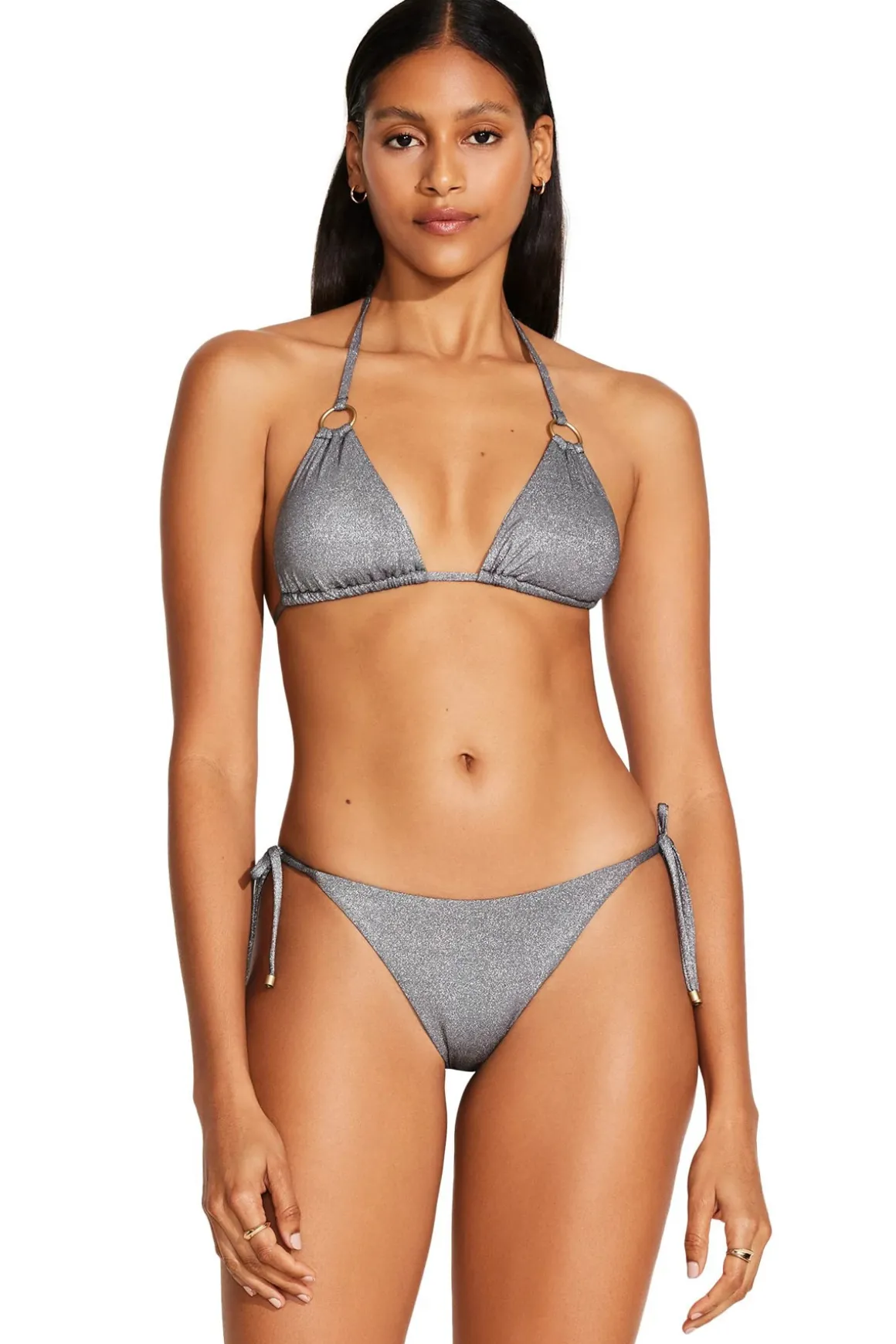 Cosmo shimmer triangle bikini top offers removable soft cups and adjustable ties at neck and back.