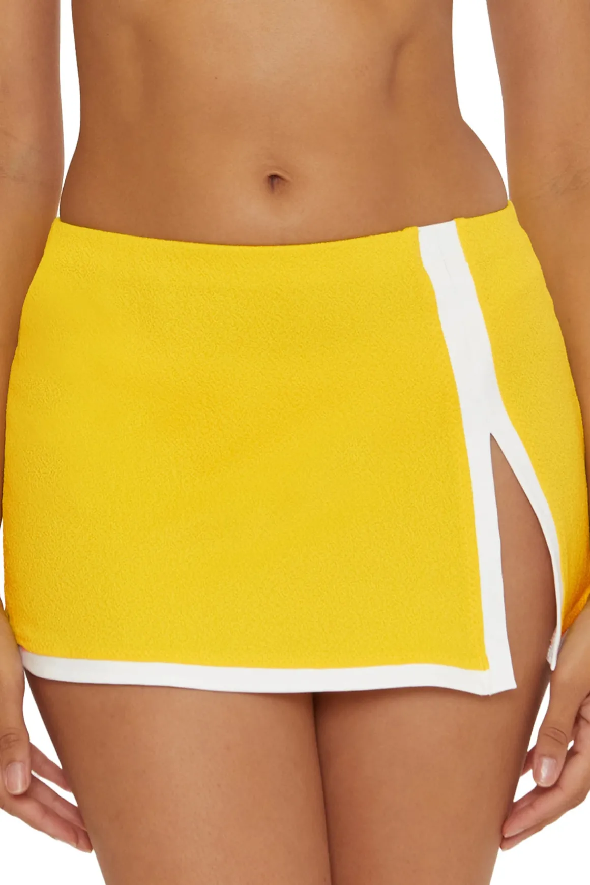 Mini skirt features textured fabric with contrasting trim and a front slit.