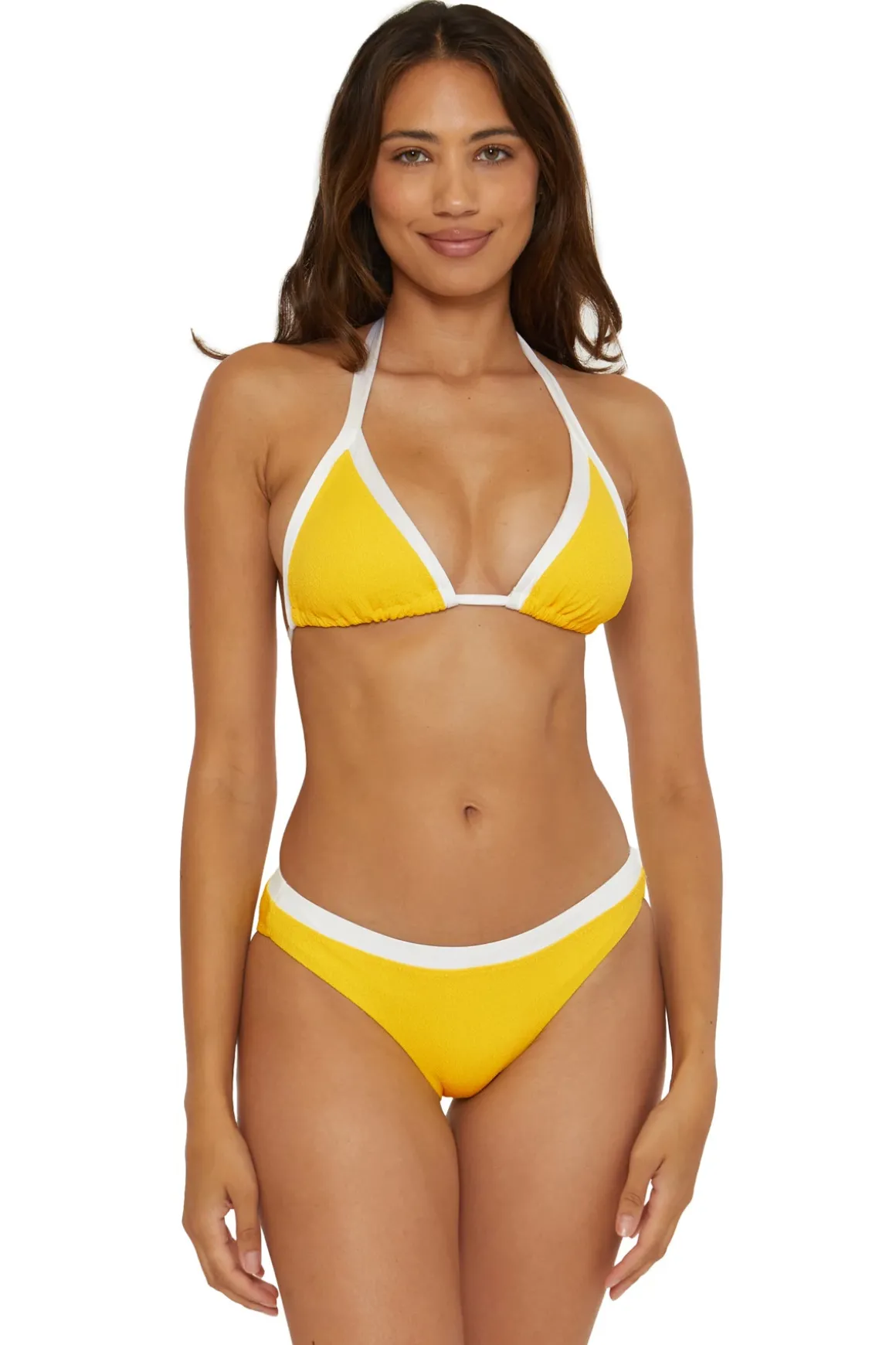Triangle bikini top features textured fabric with contrasting trim and offers removable soft cups, and adjustable ties at neck and back.