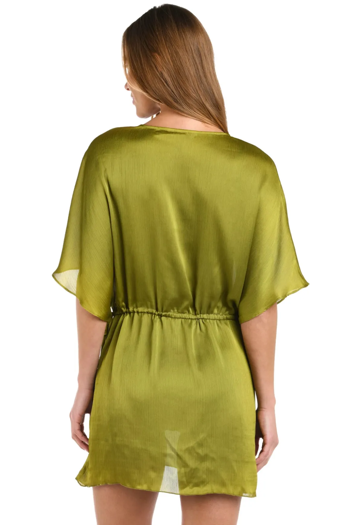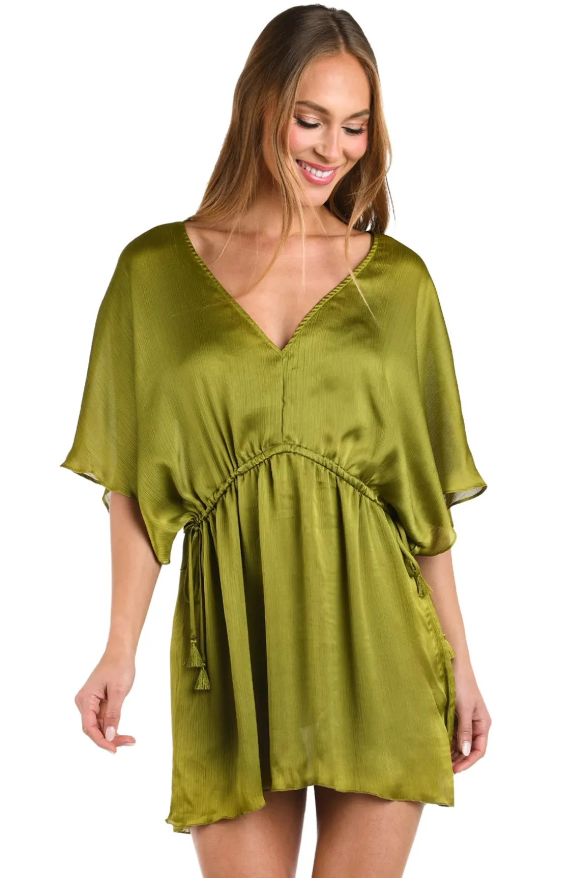 Tunic featureslightweight crinkle fabric, v-neckline, mid length sleeves, and drawstring waist.
