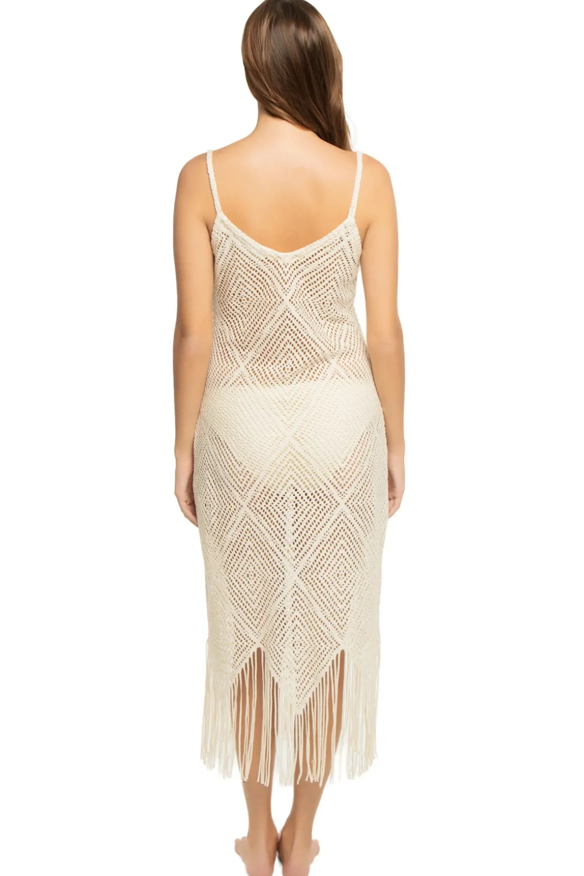Midi dress features a crochet design, round neckline, over-the-shoulder straps, and a fringed hem.