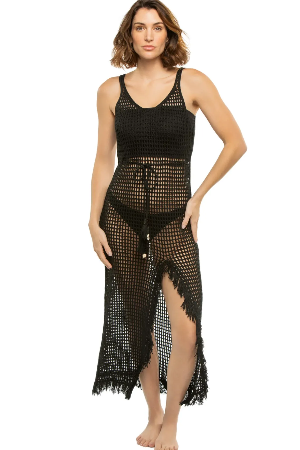 Crochet midi dress features a rounded v-neck, fringe side slit, and a tie waist.