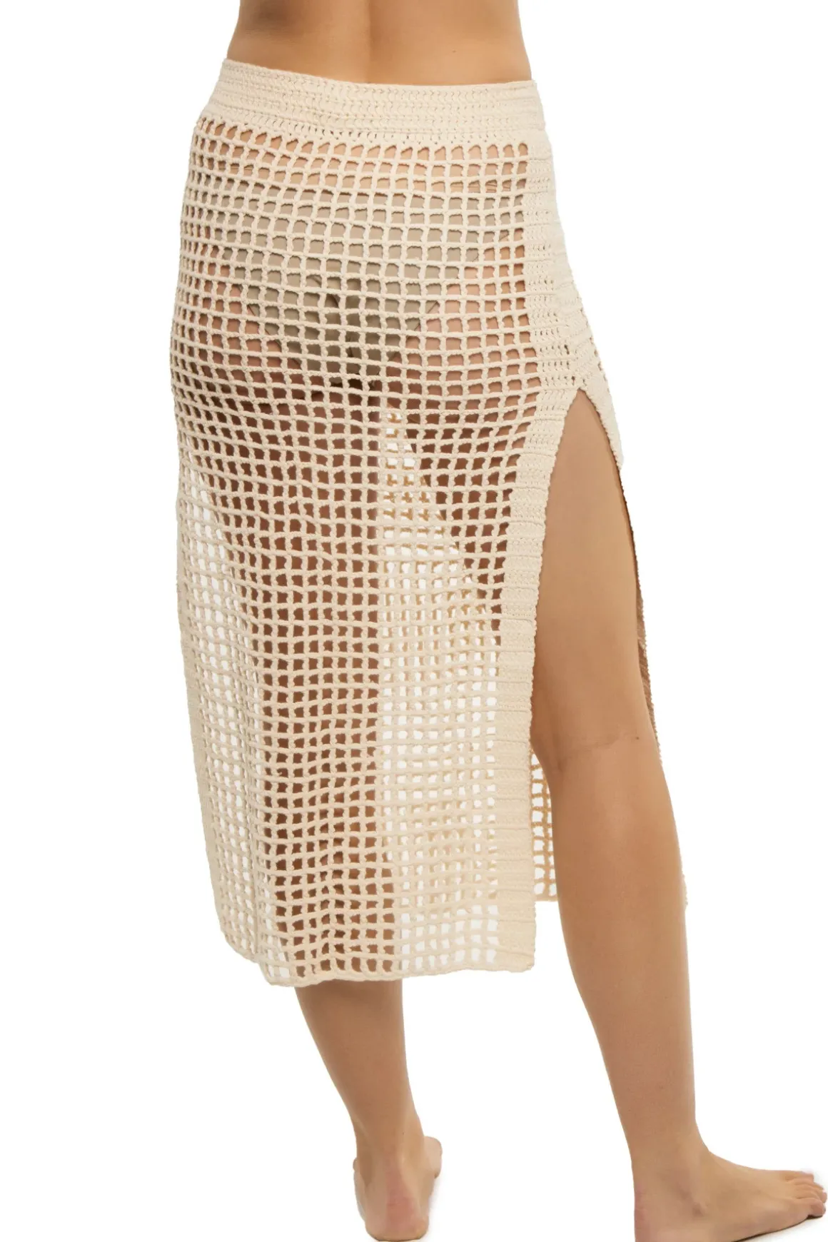 Midi skirt features open weave crochet and side slits.