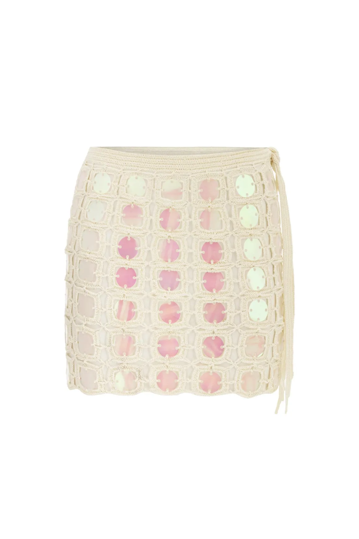 Mini skirt features open weave crochet with colorful sequins and offers a tie closure.