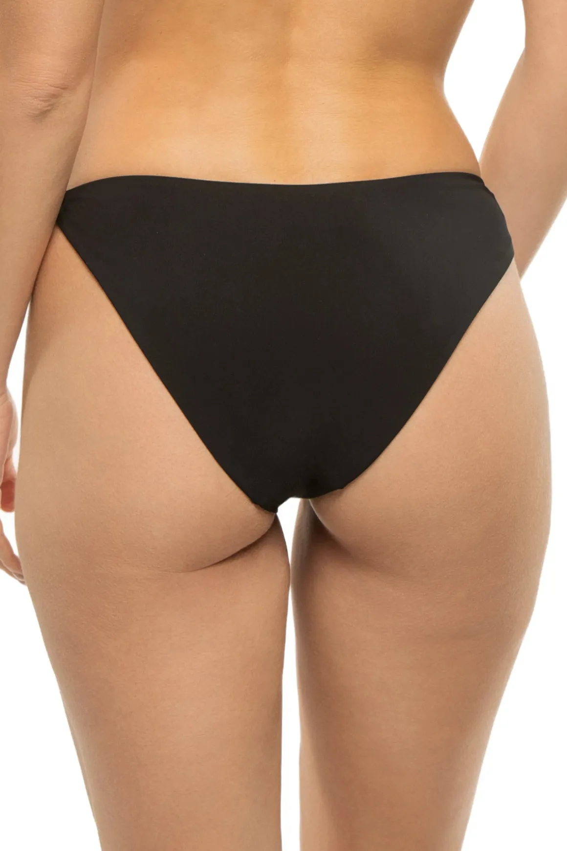 Dani hipster bikini bottom features a gold braid tab side, sheath mounting, and cheeky back coverage.