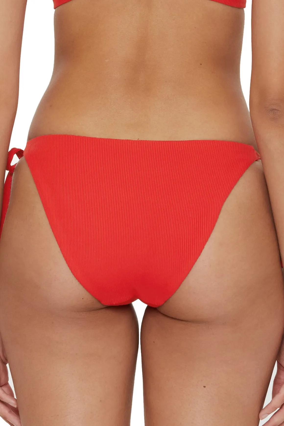 Demi hipster bikini bottom features ribbed fabric and adjustable tie sides adorned with mini horseshoe buckles. Offers moderate bottom coverage.