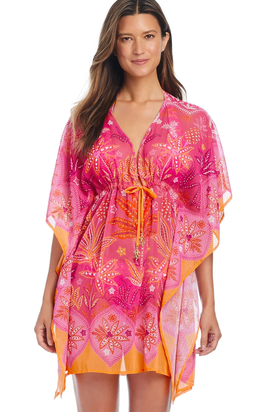Caftan features a plunging neckline, butterfly sleeves, and drawstring waist tie adorned with gold bead details.