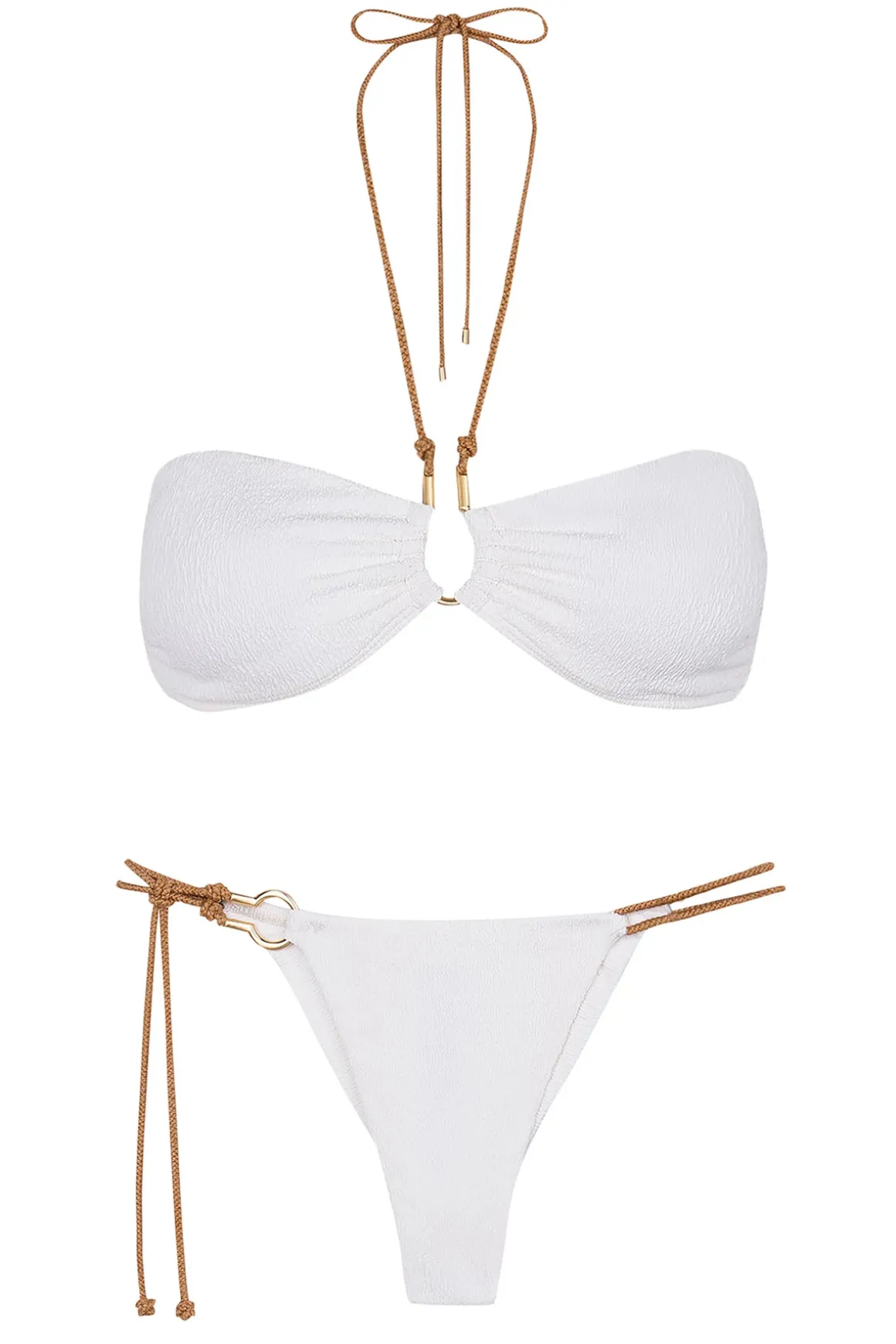 Diane textured bandeau bikini top features a keyhole with 24k gold-plated hardware accents, adjustable and convertible straps, and a clasp back closure.