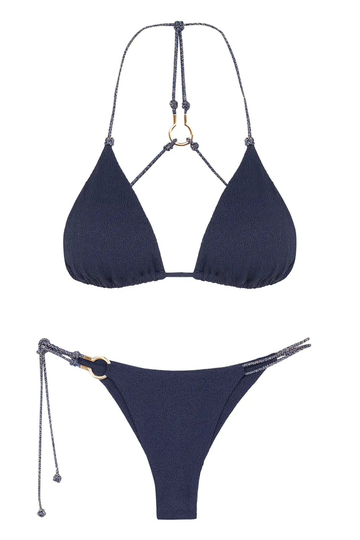 Diane brazilian bikini bottom ties at the hips, features 24k gold-plated hardware details, and offers minimal coverage.