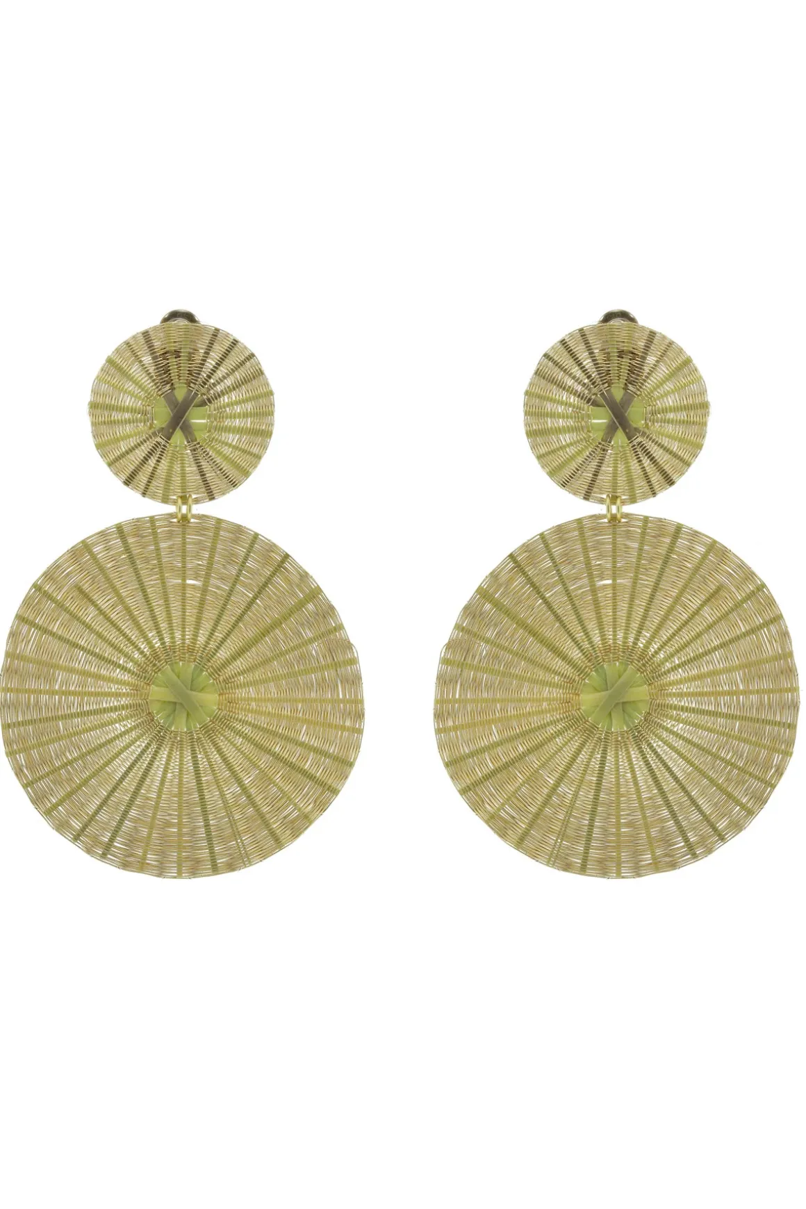 Gold plated brass earrings featuring woven raffia circular details. Clip-on fastener.