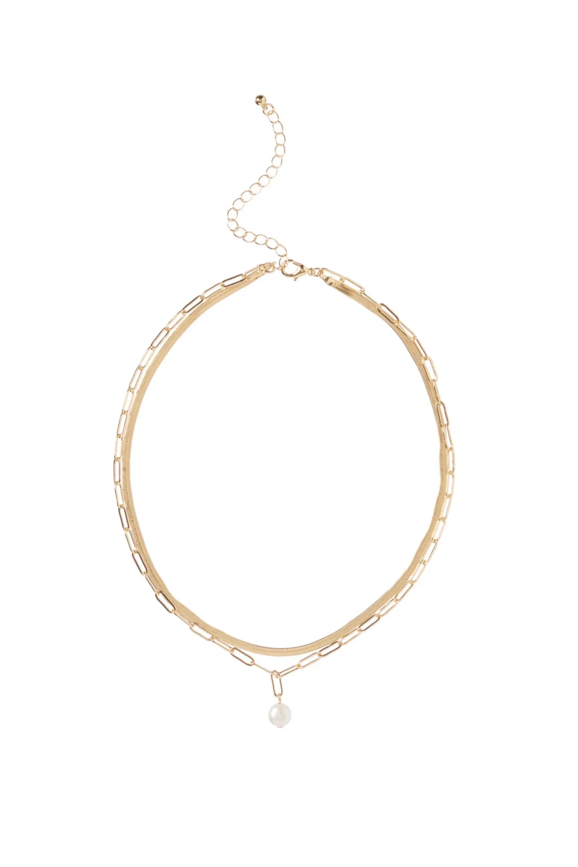 Necklace features a double chain with freshwater pearl drop detail.