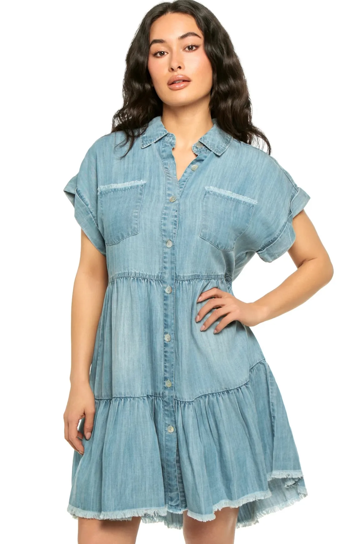 Dress shirt featuring a collared neckline, button-up front, short sleeves, and a frayed hem.