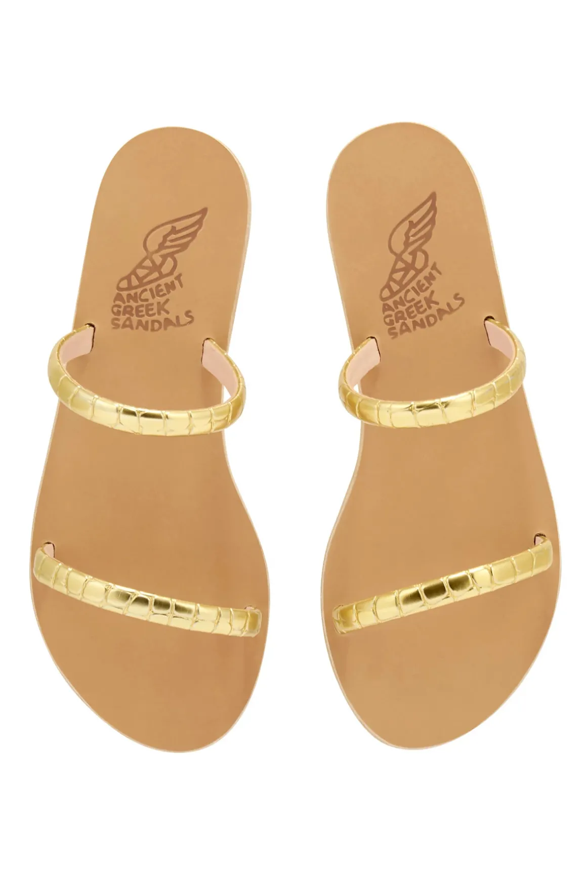 Echinda sandals feature a leather sole and serpent metallic bands.