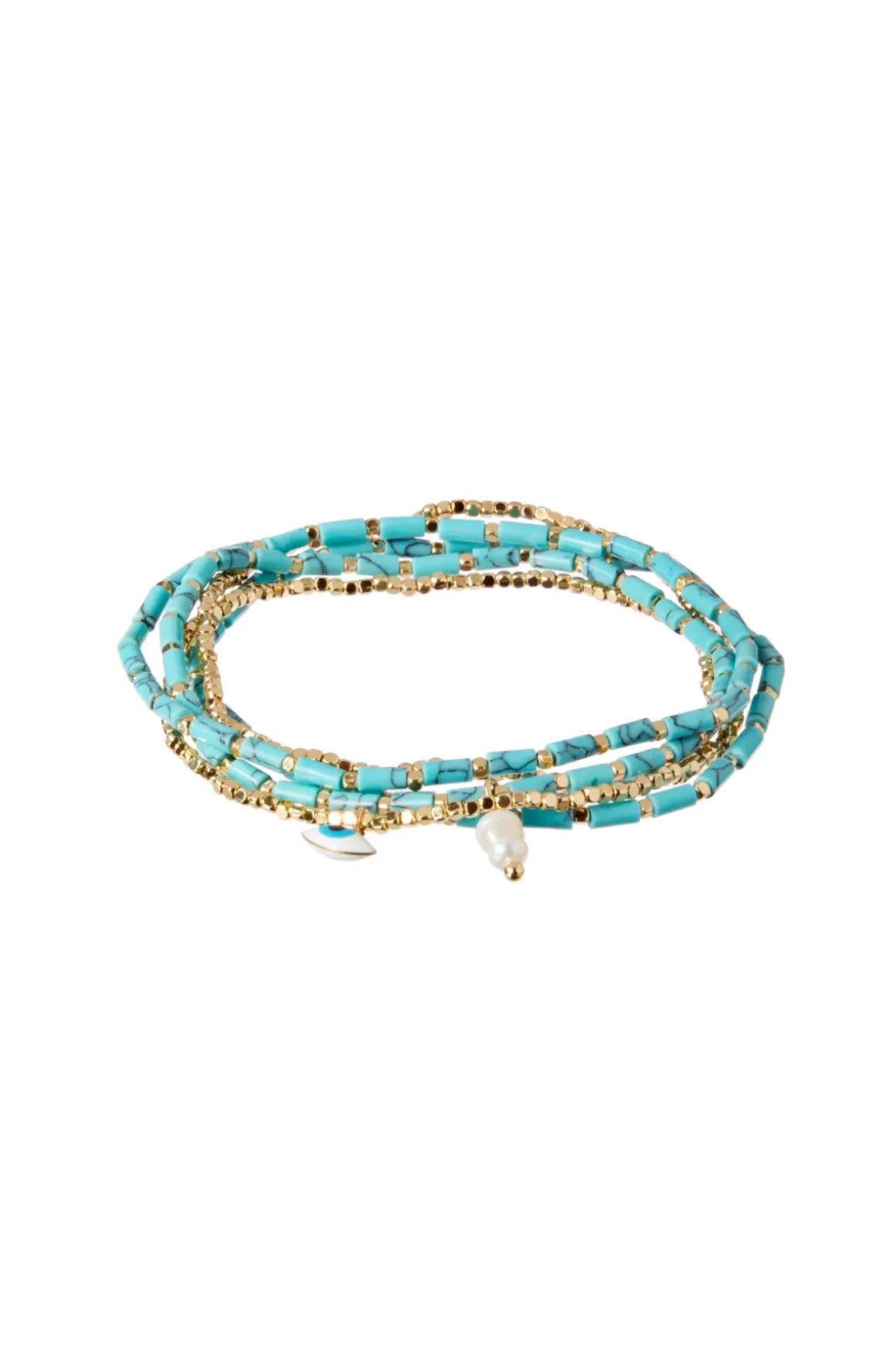 Bracelet set features stacked beaded elastic bracelets.