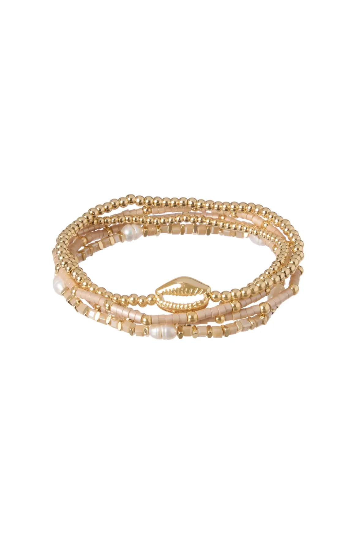 Bracelet set features stacked beaded elastic bracelets.