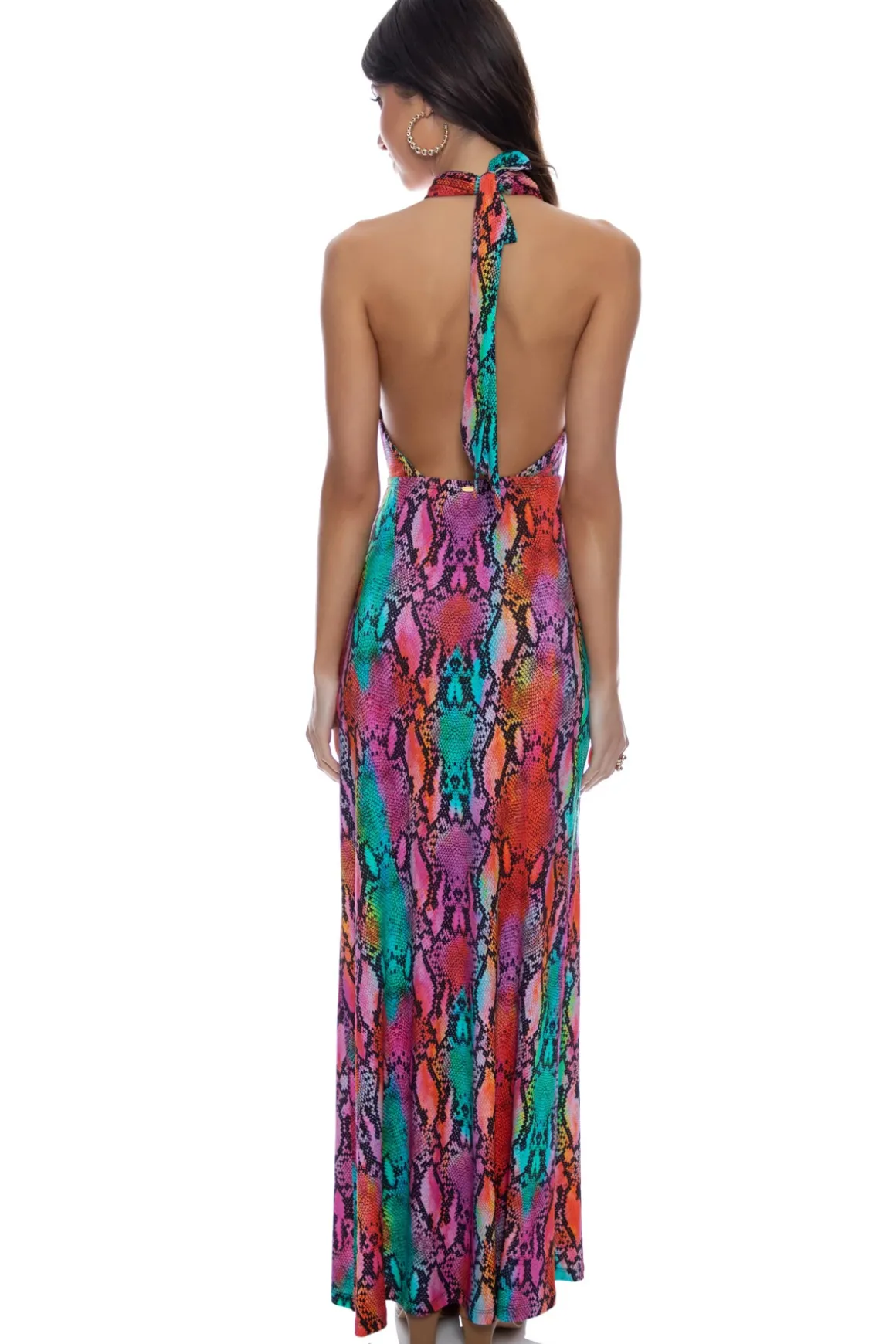 Maxi dress features colorful animal-inspired print, a peek-a-boo crossover halter neckline, and slit skirt.
