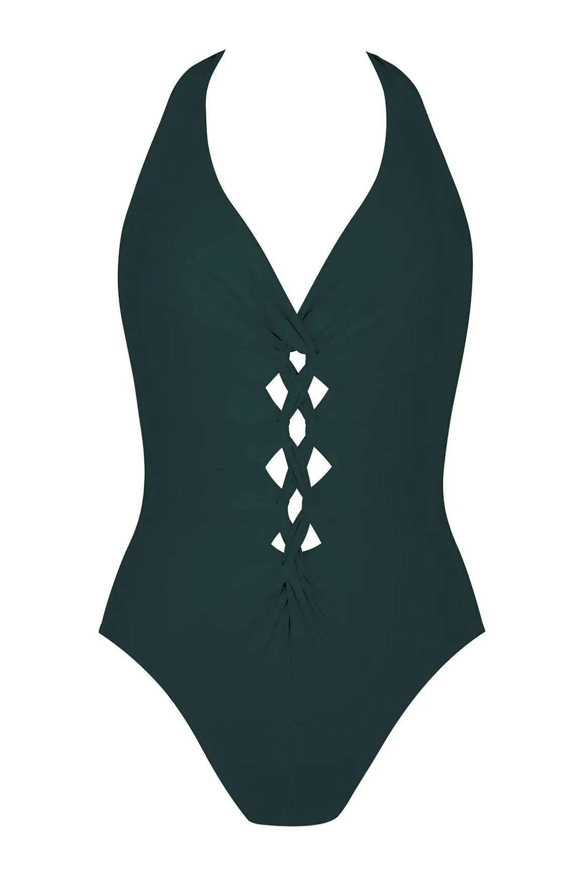 Eleni halter one piece swimsuit features a plunge twist front, ties at neck and a moderate coverage bottom.