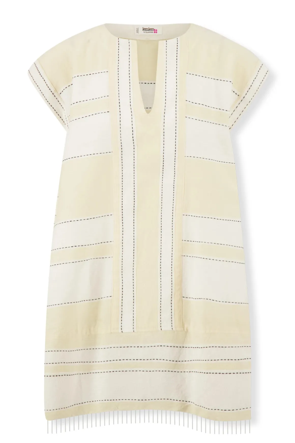 Elina caftan style tunic is hand woven and hand spun in Ethiopia and features a split neck and short sleeves.