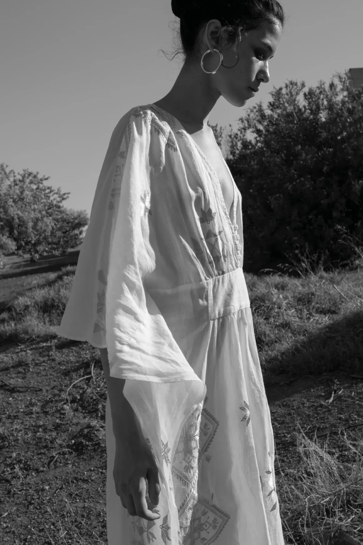Maxi dress features metallic embroidered details, deep v-neckline with a button front, and long, flowy sleeves, offering an effortlessly elegant look.