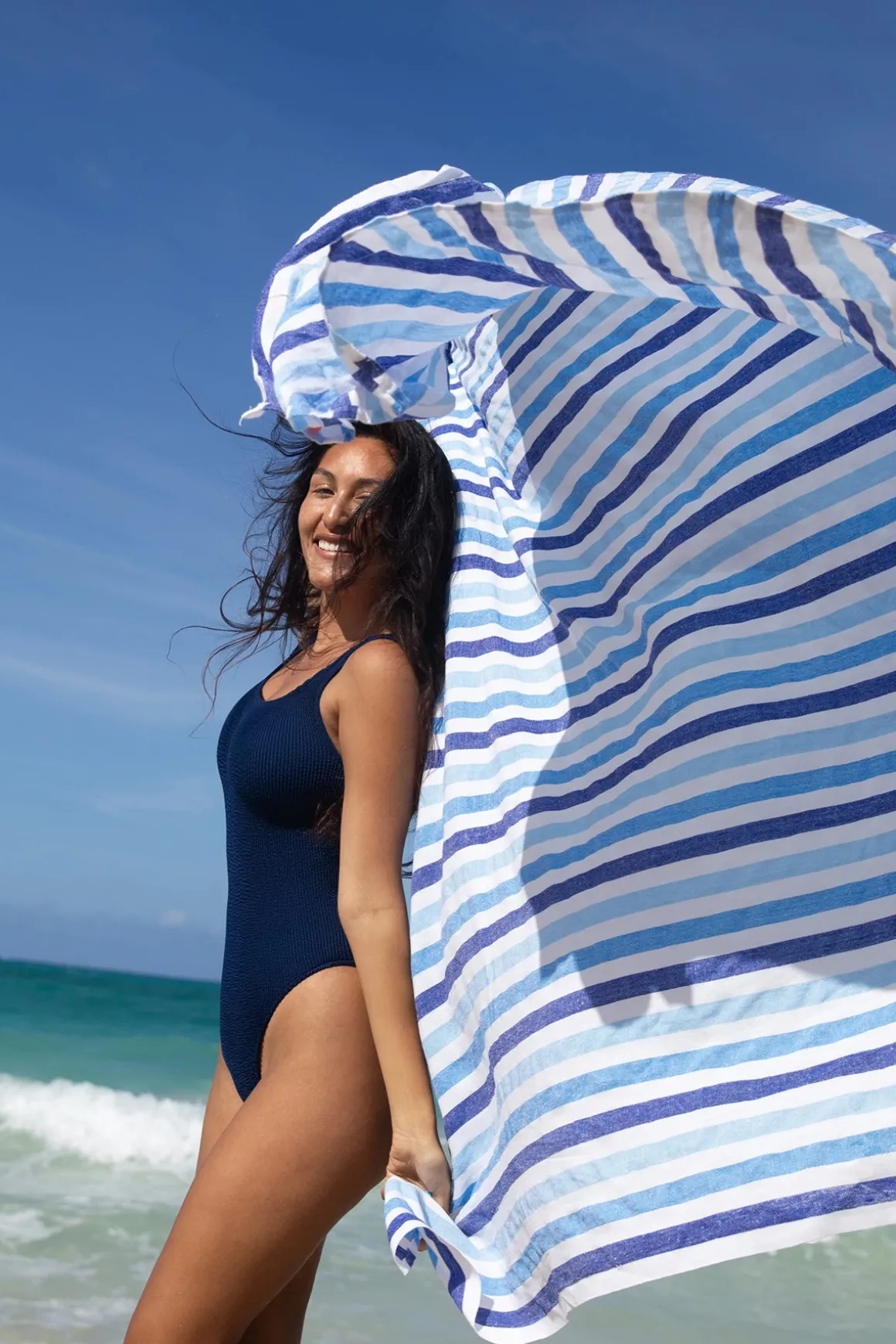 Esther beach blanket is constructed of earth-friendly recycled cotton, acrylic, which helps maintain color over time and polyester fibers make it lightweight and quick-drying.