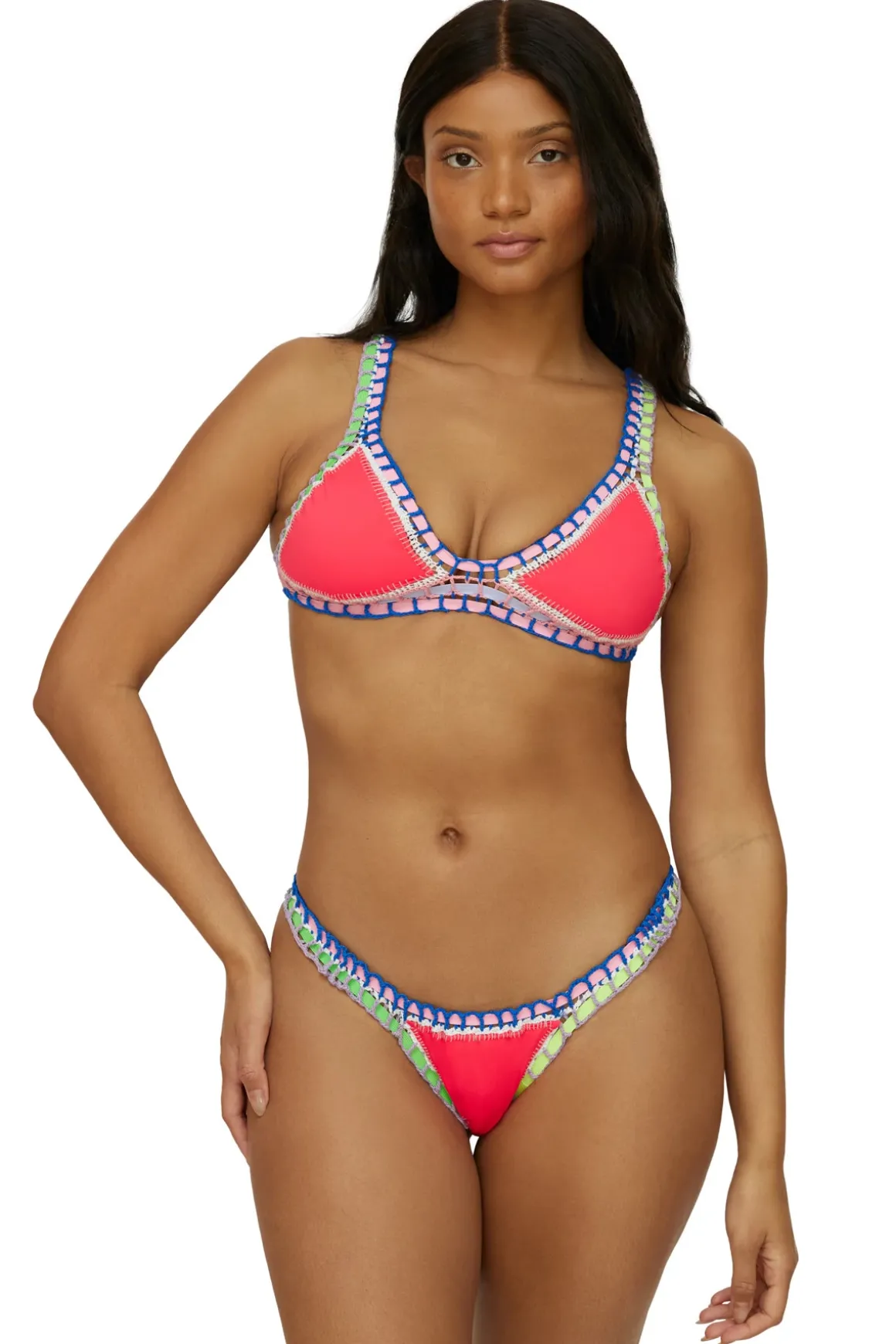 Ferrarini bikini top features exposed elastic detailing that adds a touch of vintage charm and stretchy fabric to ensure a comfortable and flattering fit for all body types.