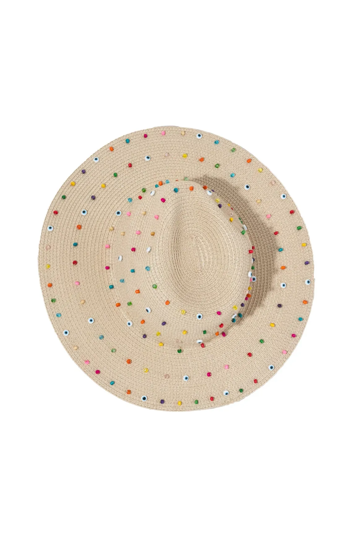 Fiesta fedora hat is adorned with multi-colored beads and evil eye accents.